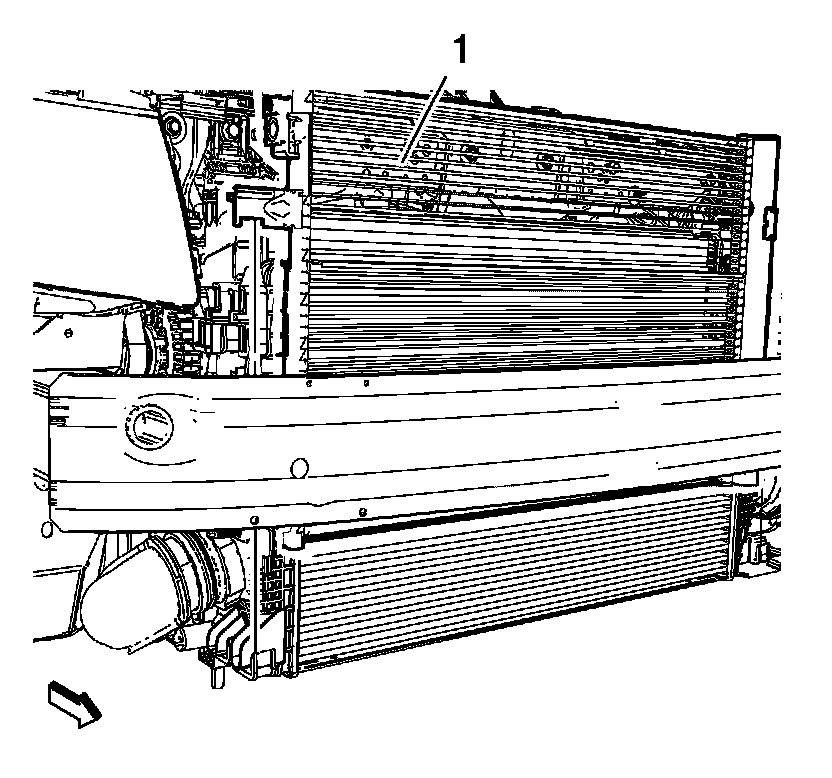 7. Remove the radiator air side upper baffle (1).