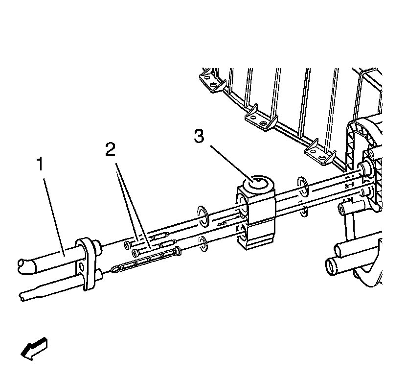 2. Install air conditioning evaporator hose (1) to A/C evaporator TXV (3). Refer to Air Conditioning Evaporator Hose Assembly Replacement Air Conditioning Evaporator Hose Assembly Replacement.