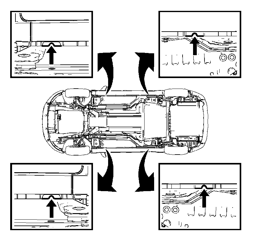 This vehicle is not designed to be lifted by a service jack. Only hoist the vehicle at the four locations, as indicated.
