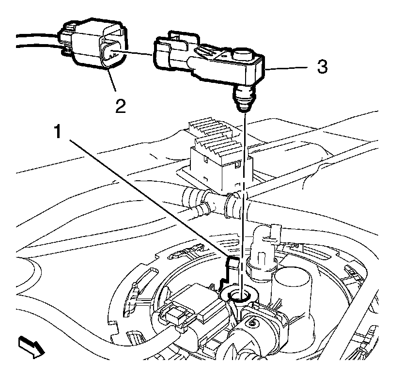 1. Clip the fuel tank pressure sensor (3) to the fuel tank pump module clip (1).