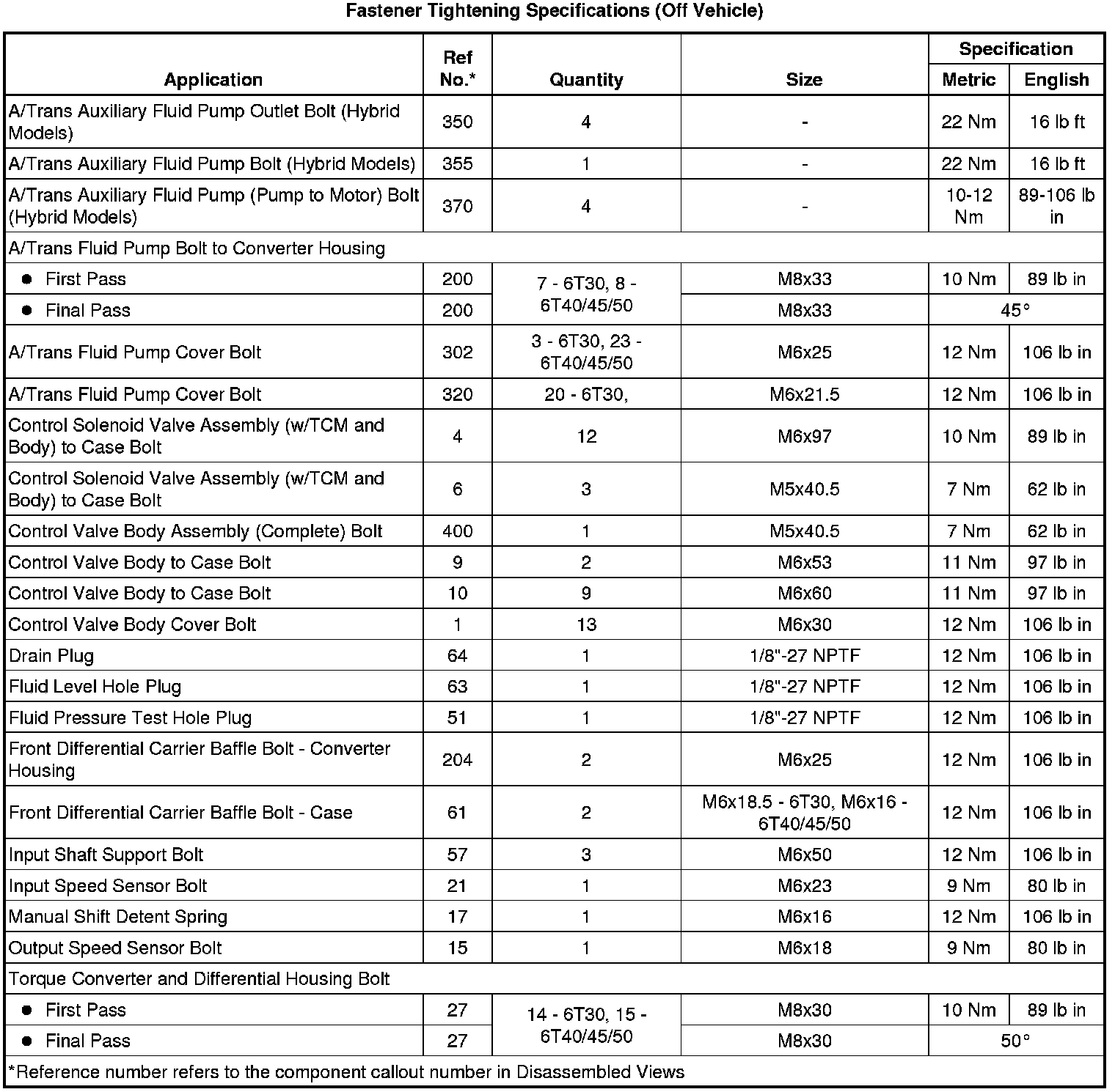 Fastener Tightening Specifications (Off Vehicle)