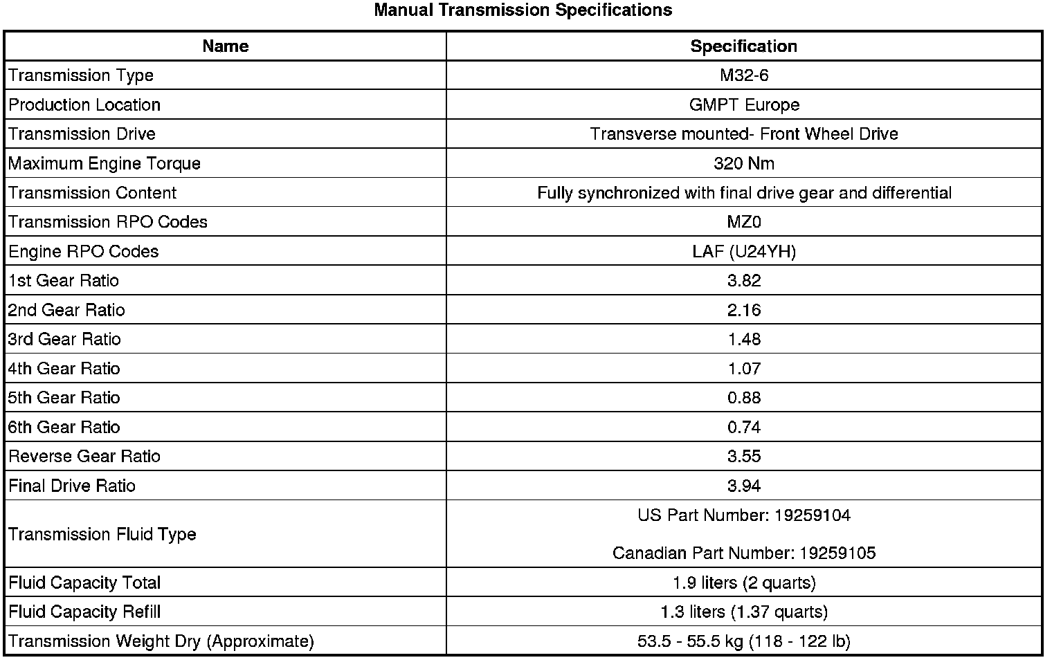 Manual Transmission Specifications