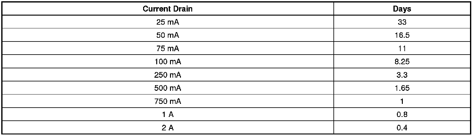* The battery run down time will vary depending on the batteries reserve capacity. If the reserve capacity is higher, then the battery run down time may be longer. If the reserve capacity is lower, then the battery run down time may be shorter. The graph below indicates roughly how many days a 690 cold cranking amperage battery with a 110 min. reserve capacity starting at 80 percent state of charge will last with a constant current draw until it reaches 50 percent state of charge. Differences in battery reserve capacity and temperature will affect the results.