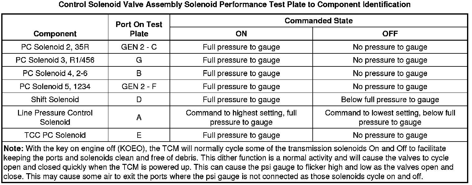 The purpose of this procedure is to test the functionality of the control solenoid valve assembly solenoids for a gross stuck open or stuck closed condition. DT-48616 - test plate is bolted to the control solenoid valve assembly on the valve body mounting surface. Pressurized air is passed into the aluminum test block, through the control solenoid valve assembly solenoid passage and back to a pressure gauge on the test block. The pressure gauge indicates open if air pressure is passed through the solenoid, or closed if the solenoid is unable to pass air through. A scan tool is used to command the solenoids ON and OFF. While watching the pressure gauge, one can determine the valve functionality.
