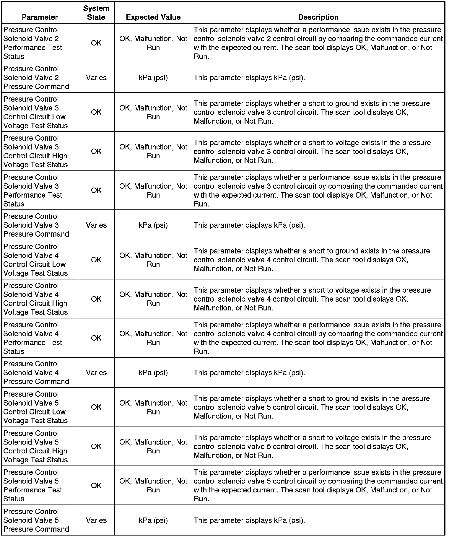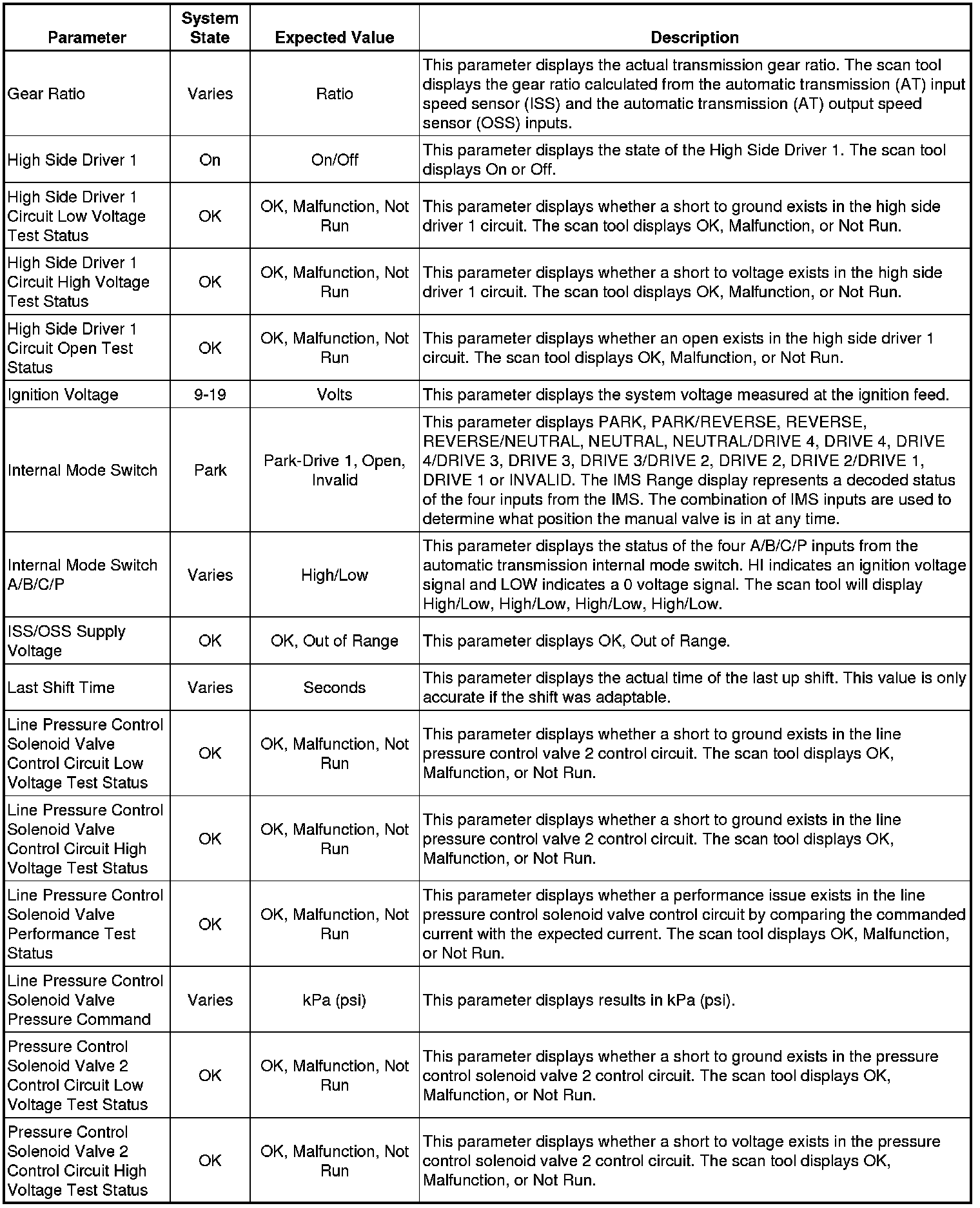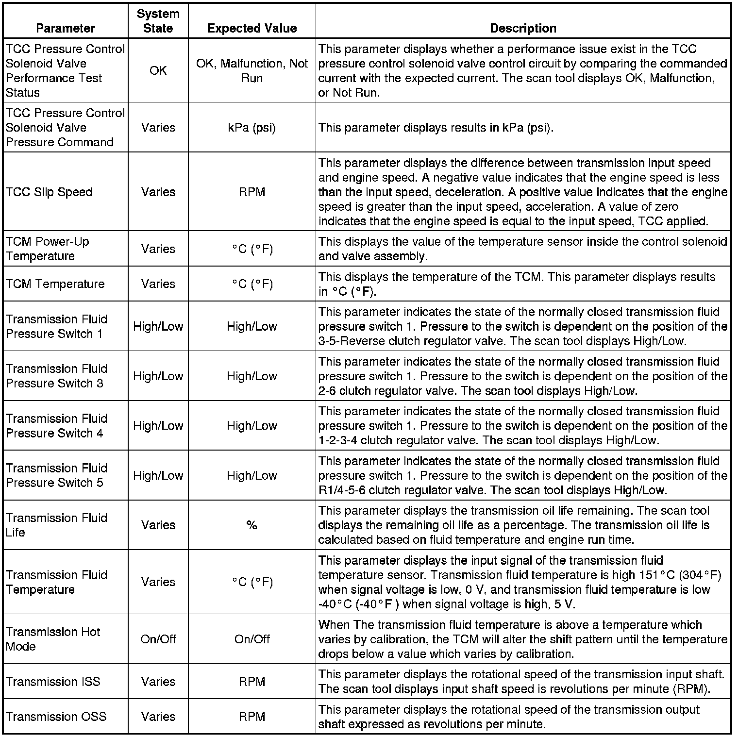 The Transmission Control Module Scan Tool Data List contains all transmission related parameters that are available on the scan tool. The list is arranged in alphabetical order. A given parameter may appear in any one of the data lists, and in some cases may appear more than once, or in more than one data list in order to group certain related parameters together.