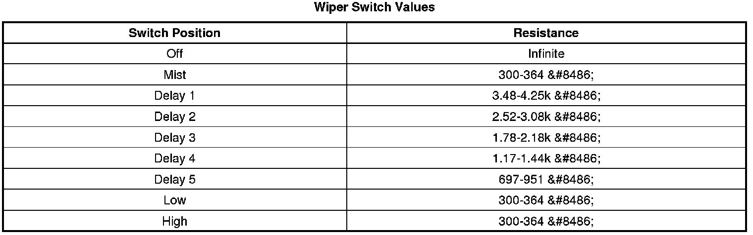 3. While cycling the S82 Windshield Wiper/Washer Switch through each delay and speed position, test for the specified resistance between the low reference terminal 2 and the signal terminal 3.