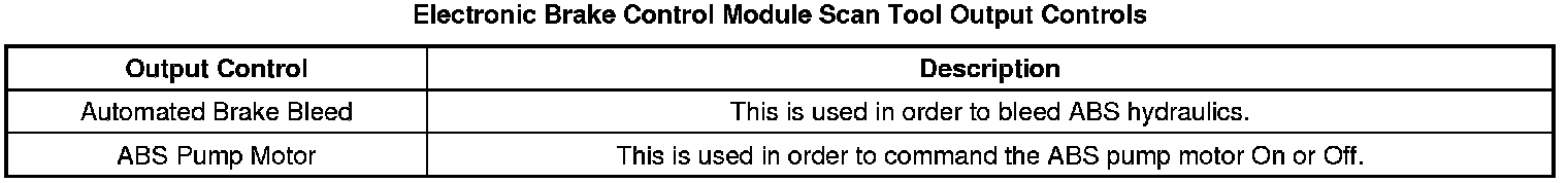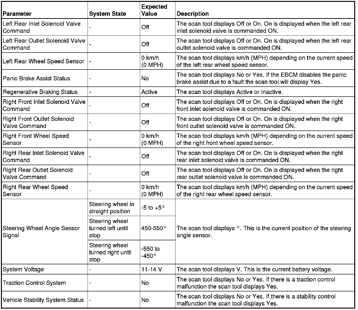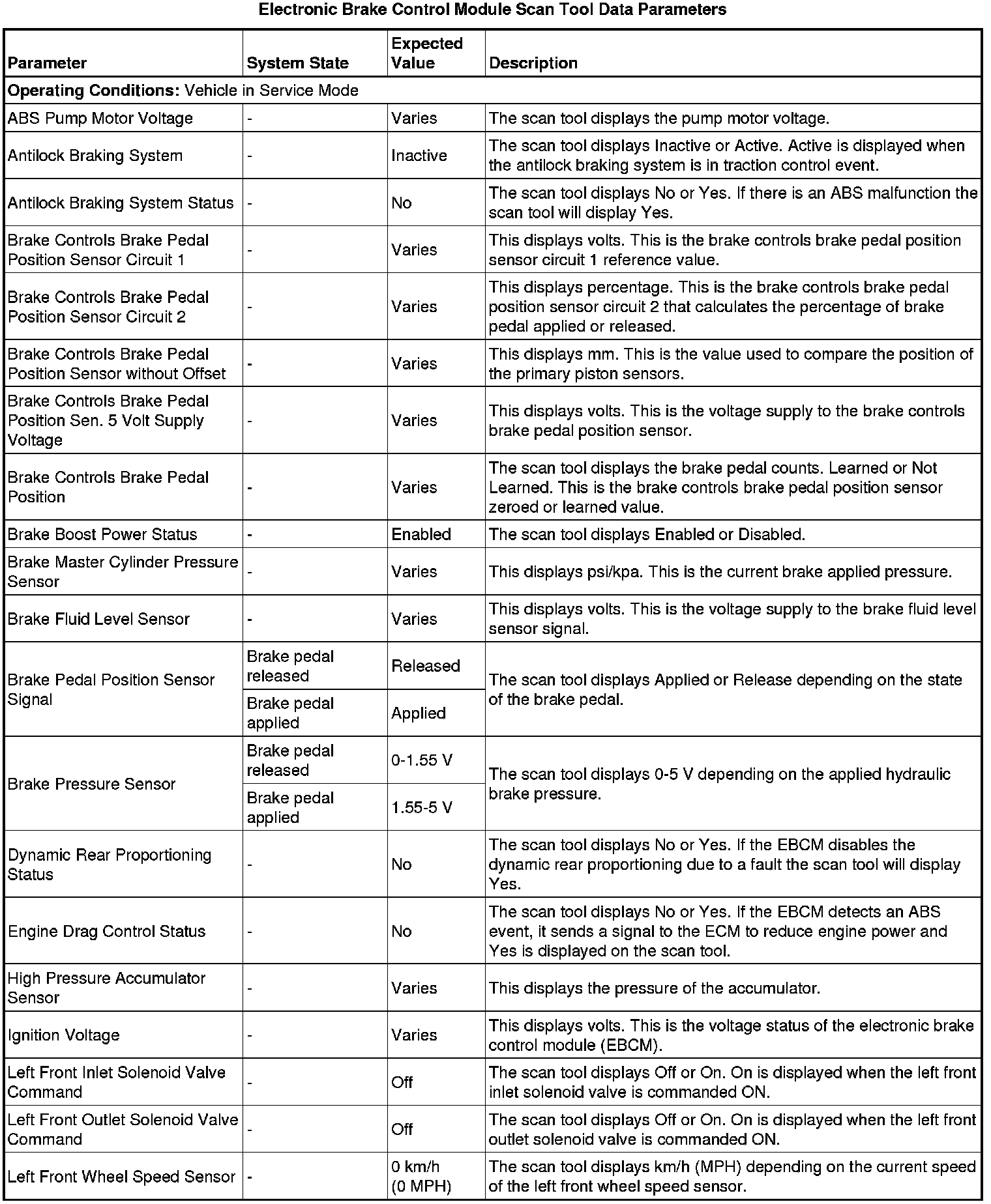 The electronic brake control module (EBCM) scan tool data parameters list contains all ABS related parameters that are available on the scan tool. The list is arranged in alphabetical order. A given parameter may appear in any one of the data lists.