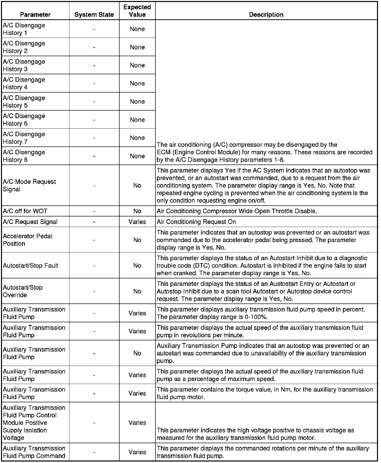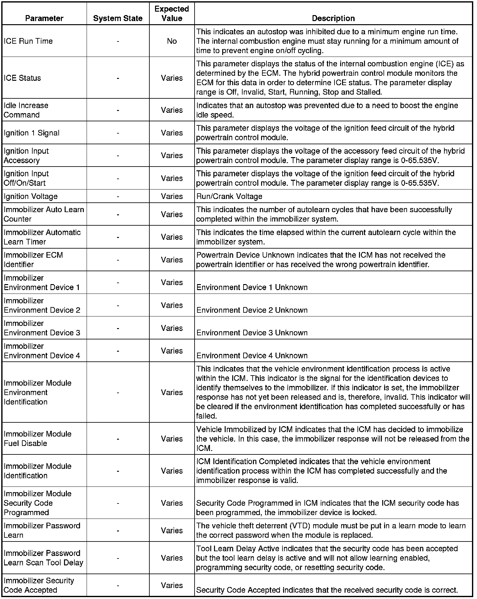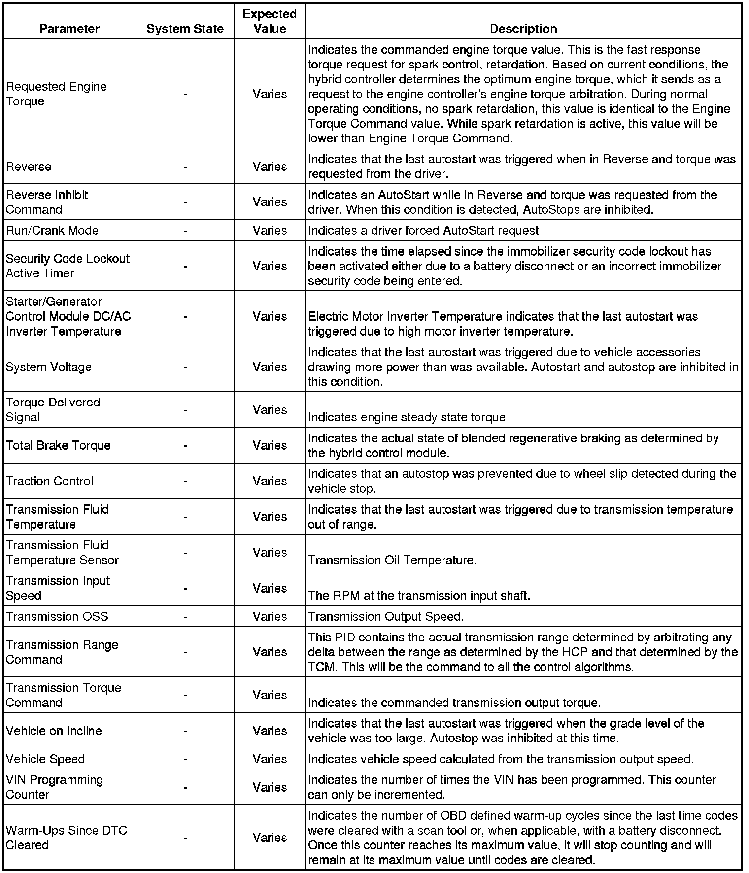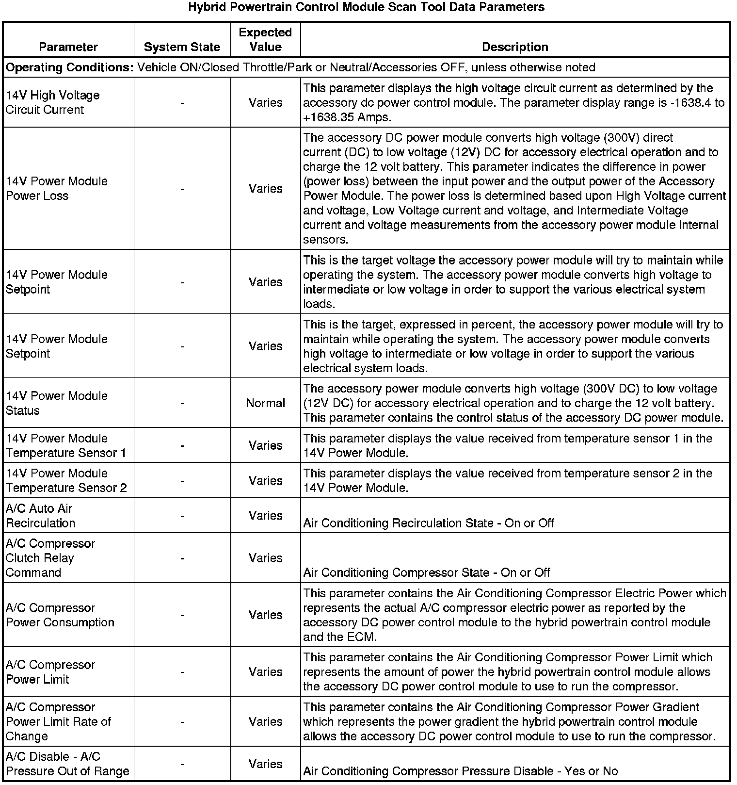 The scan tool values from a properly running vehicle may be used for comparison with the vehicle you are diagnosing. The Hybrid Powertrain Control Module Scan Tool Data Parameters list represents values that would be seen on a normally running vehicle.