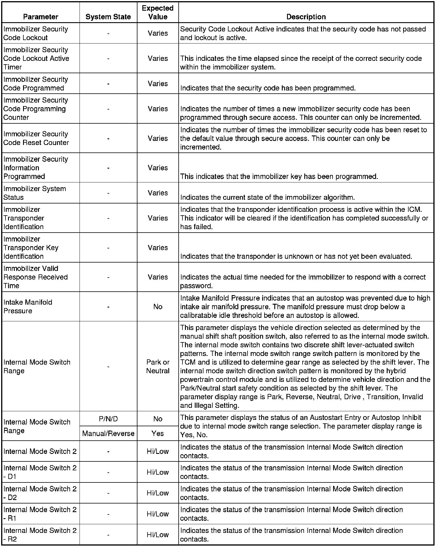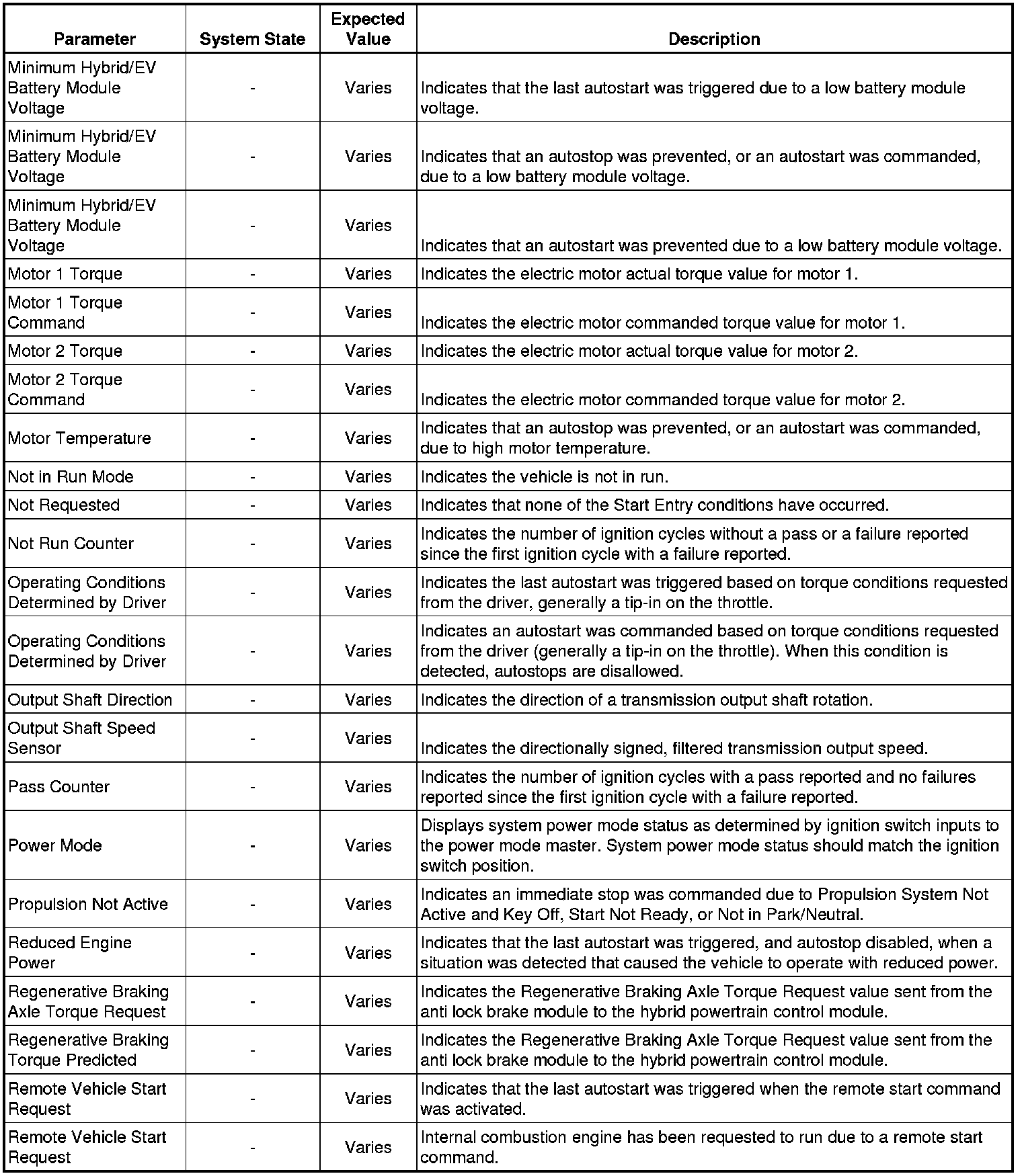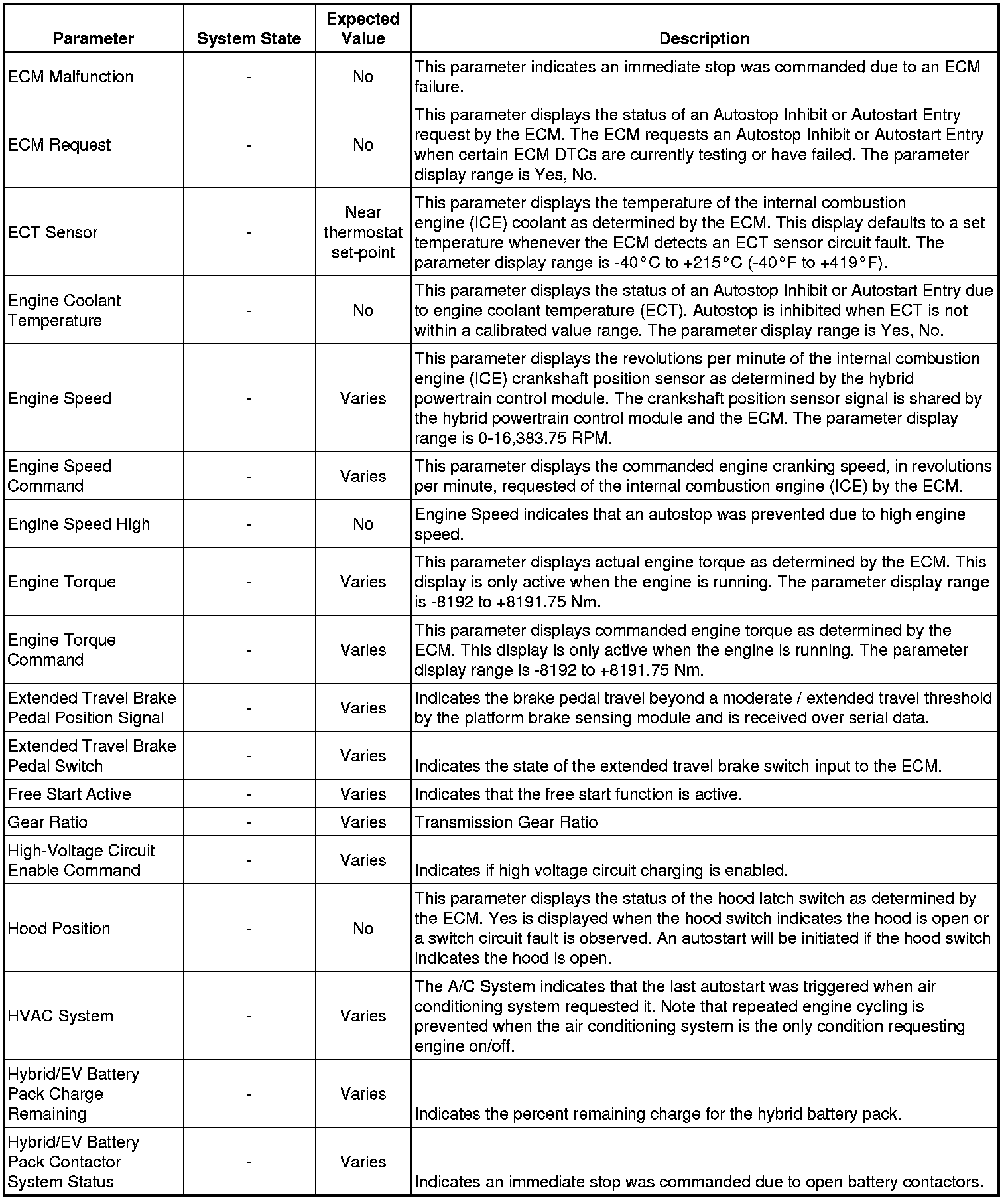 Only the parameters listed below are referenced in this service manual for use in diagnosis. If all values are within the typical range described below, refer to Symptoms - Hybrid Controls Symptoms - Hybrid Controls for diagnosis.