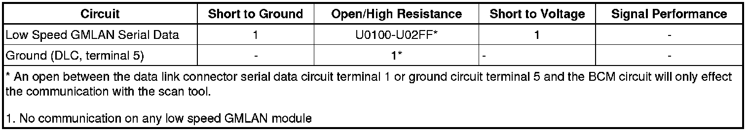 * Communication may be available between the body control module (BCM) and the scan tool with the low speed GMLAN serial data system inoperative. This condition is due to the BCM using both the high and low speed GMLAN systems.
