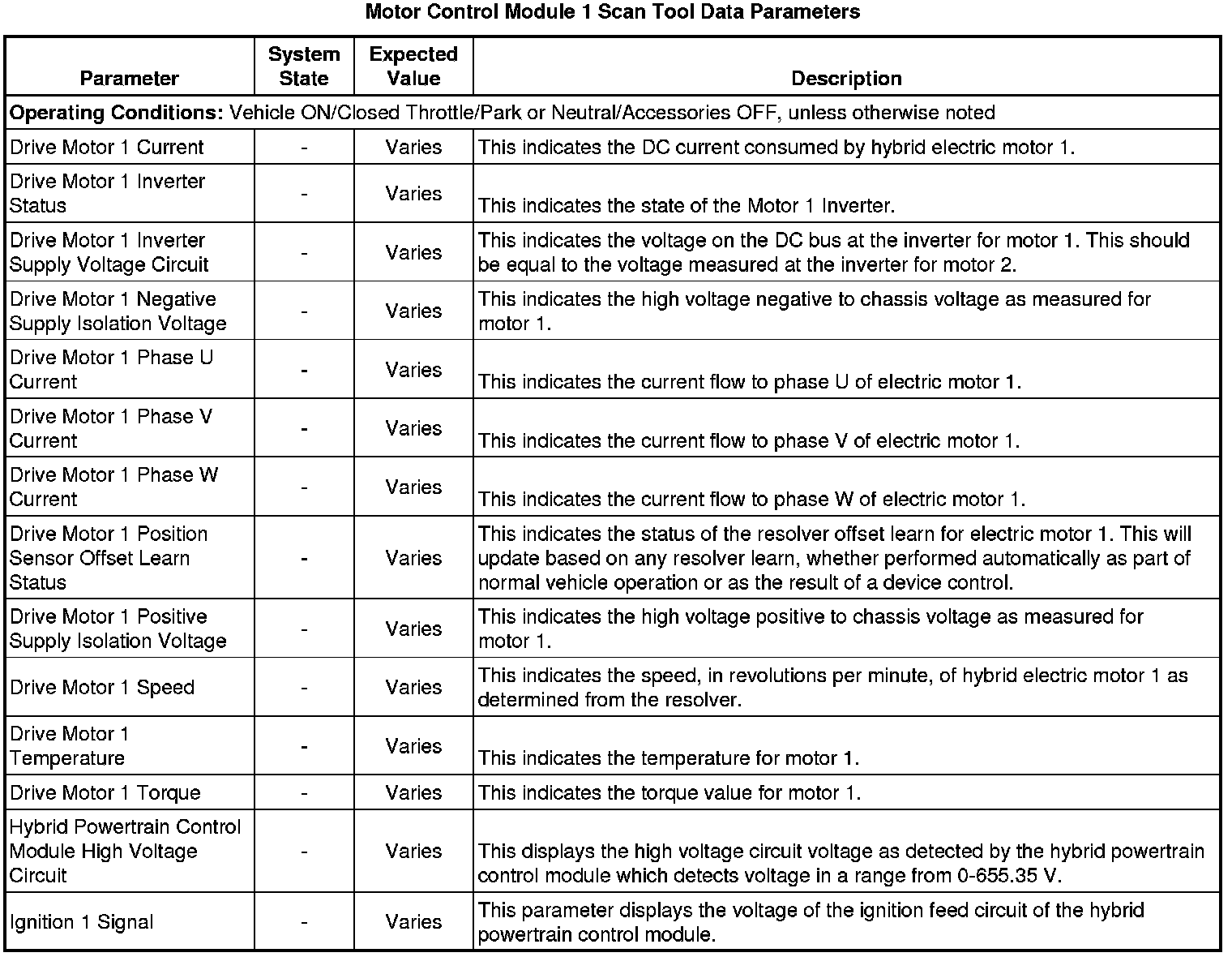Only the parameters listed below are referenced in this service manual for use in diagnosis. If all values are within the typical range described below, refer to Symptoms - Hybrid Controls Symptoms - Hybrid Controls for diagnosis.