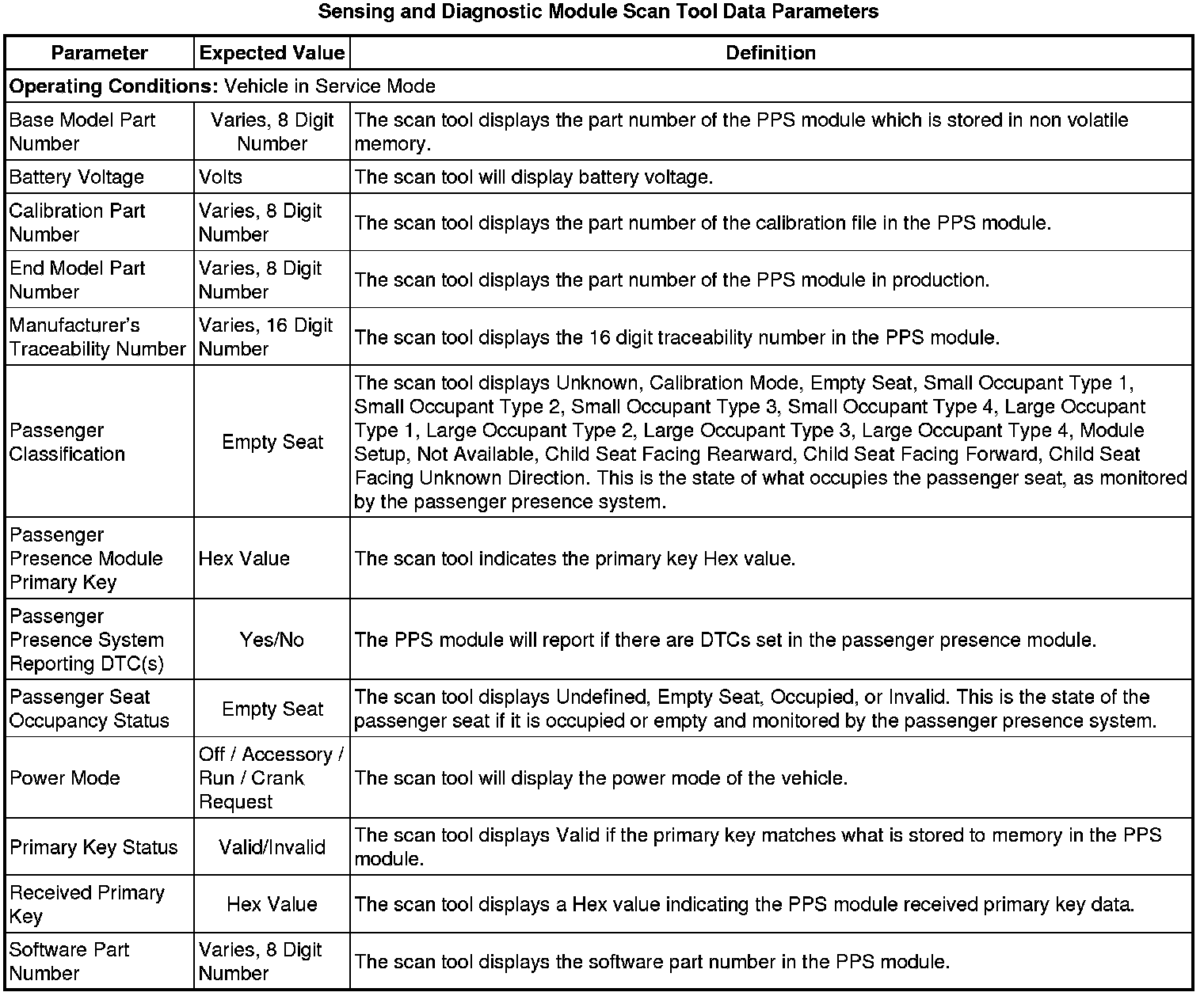 Inflatable Restraint Passenger Presence System Scan Tool Information