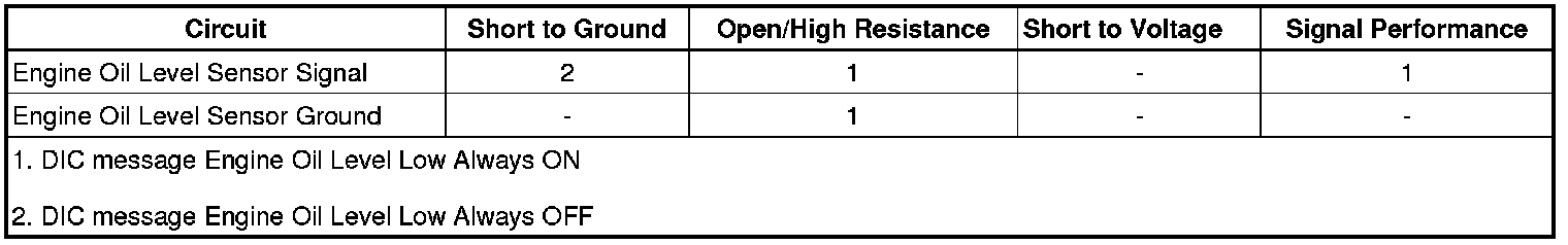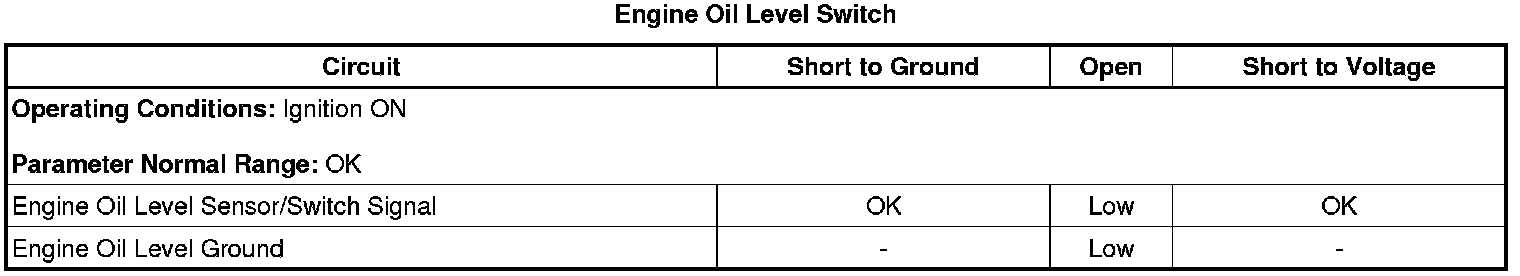 The engine oil level sensor/switch is a normally-closed with proper engine oil level. The switch opens when the engine oil level drops below a calibrated level. The engine control module (ECM) monitors the engine oil level signal circuit when the ignition is ON, and the engine is OFF. With the switch in the closed position, the ECM detects a low voltage signal circuit. With the switch in the open position, the ECM detects a high voltage on the signal circuit. When high voltage is detected on the signal circuit, the ECM will send a serial data message to the instrument panel cluster and a message is displayed on the driver information center.