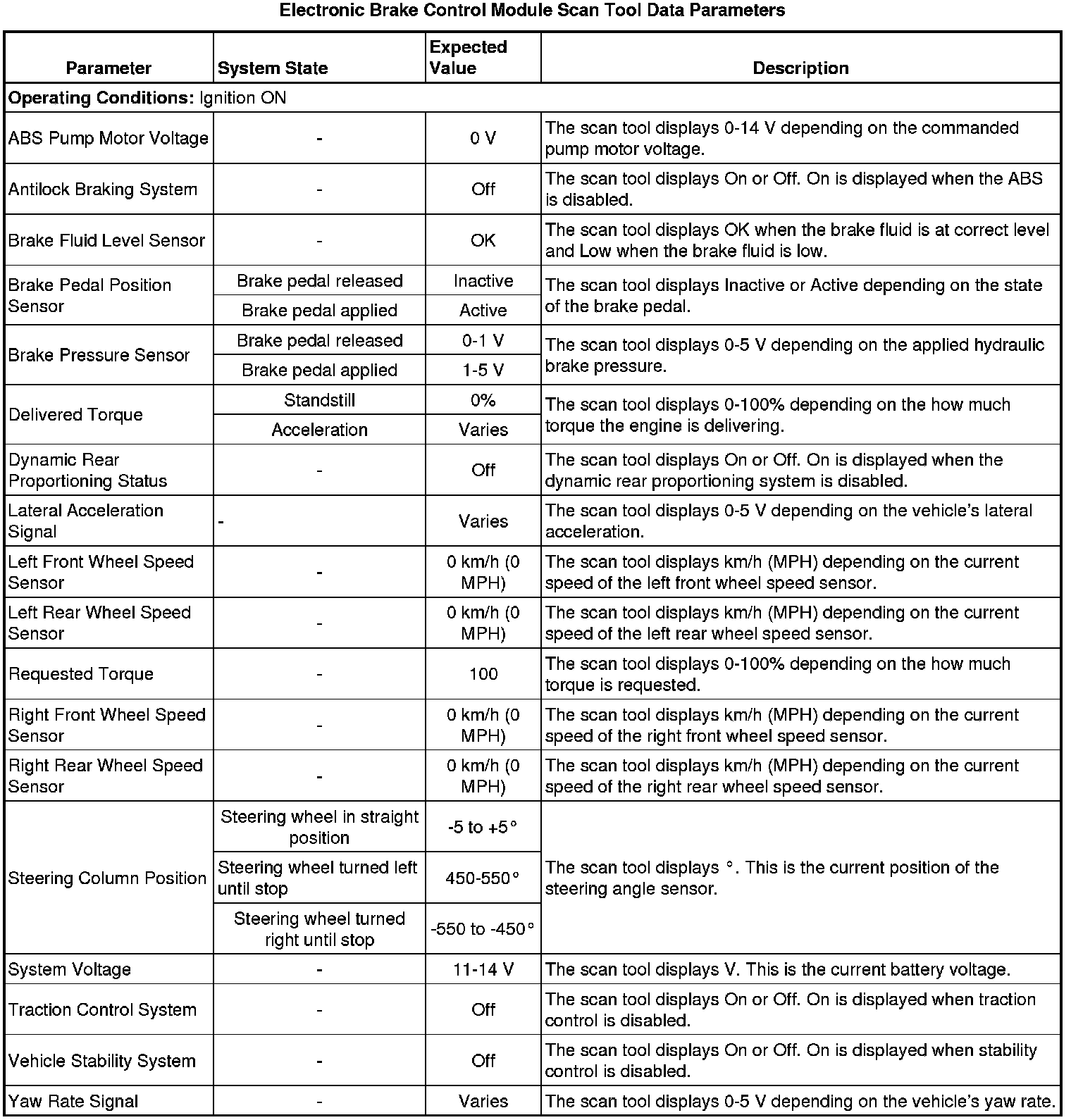The Electronic Brake Control Module scan tool data parameters list contains all ABS related parameters that are available on the scan tool. The list is arranged in alphabetical order. A given parameter may appear in any one of the data lists.
