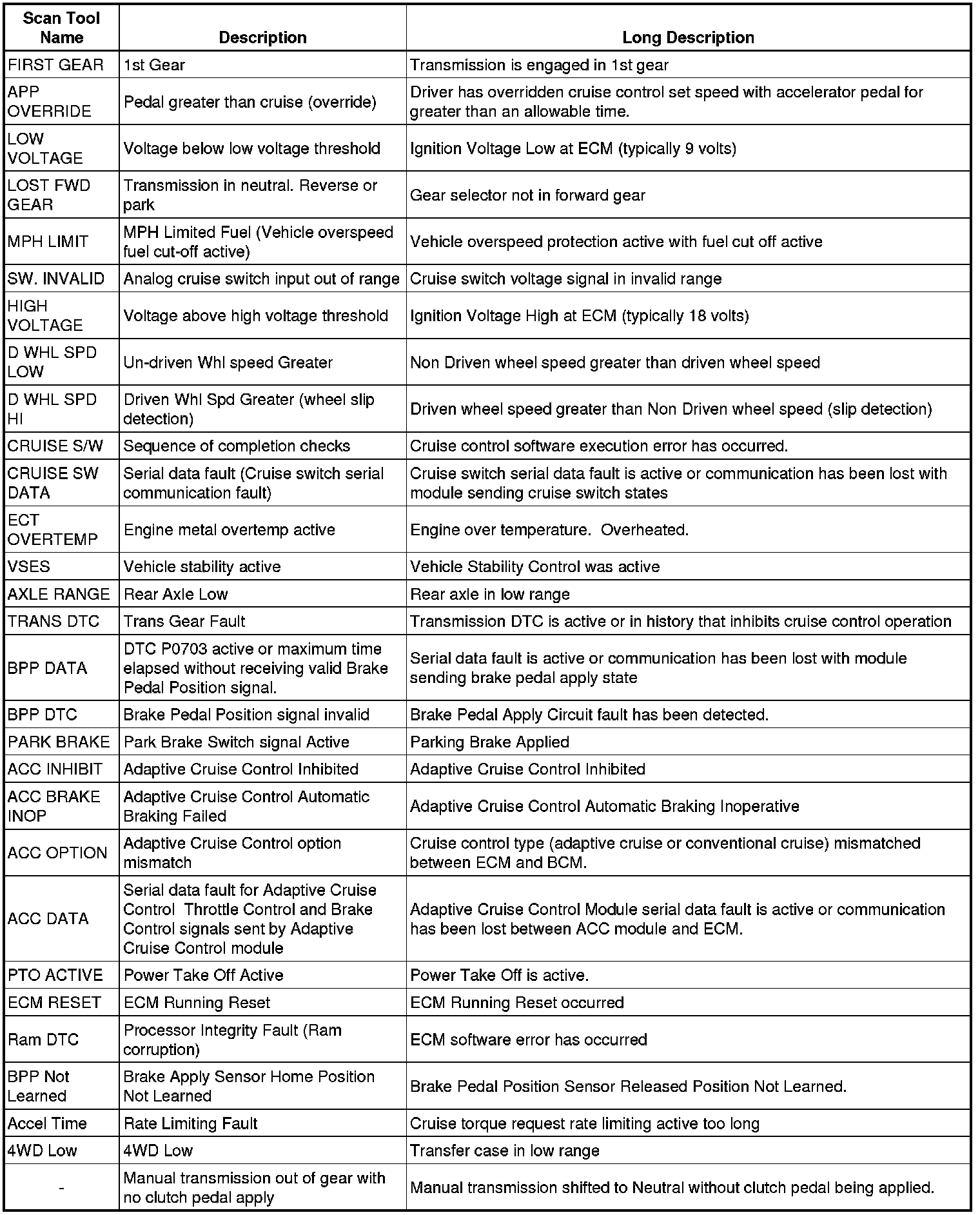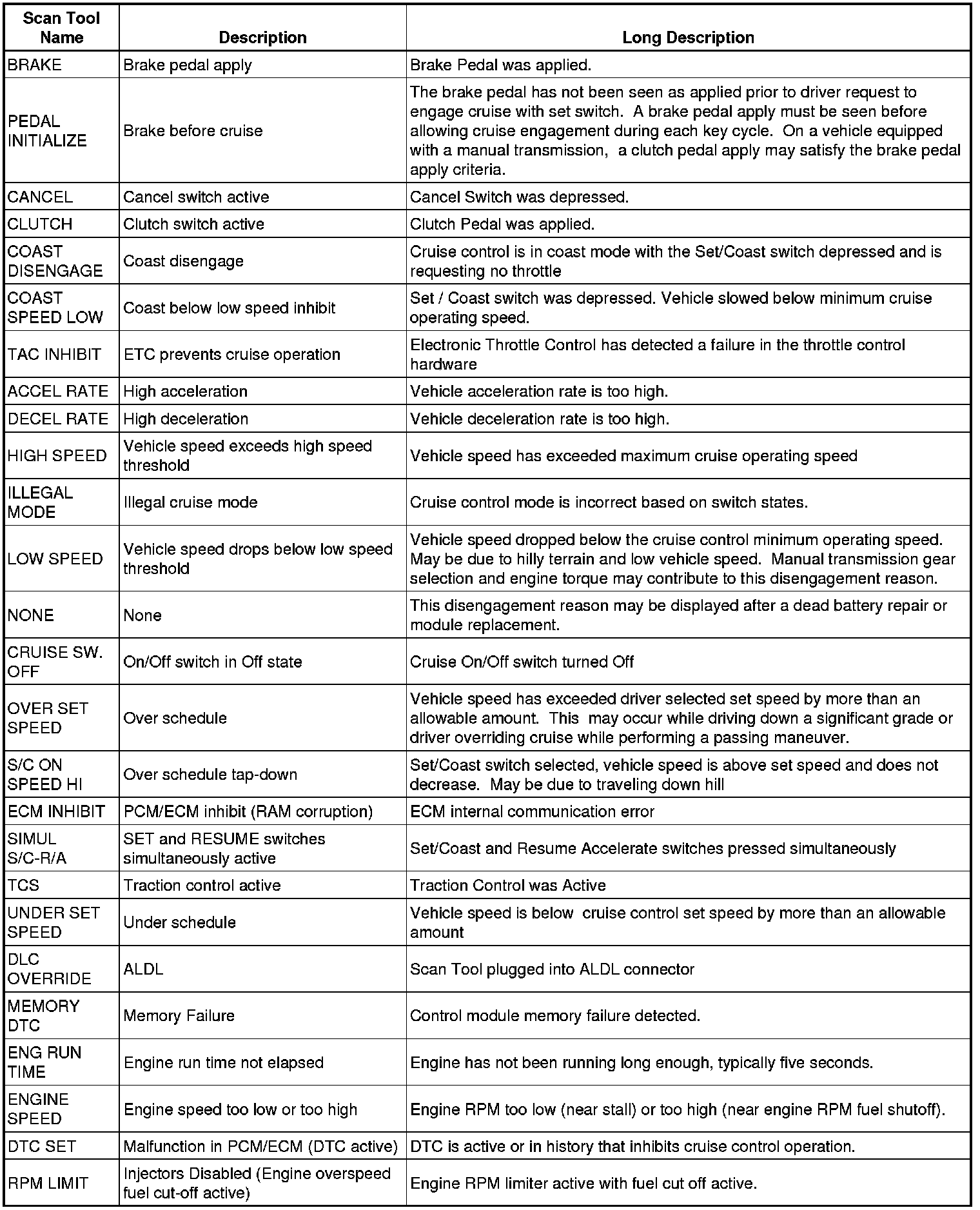 Every time the Cruise Control System is disengaged, the ECM will keep track of the reason for system disengagement. The last 8 disengagement reasons will be recorded within the ECM memory. The scan tool will display the last 8 Cruise Disengage History parameters, in which one out of approximately 50 possible reasons will be displayed in each of these 8 parameters. For the disengagement reason to be displayed within the scan tool parameter either the Cruise Control System is active and disengagement is requested, or engagement of the system is requested but a fault is present.