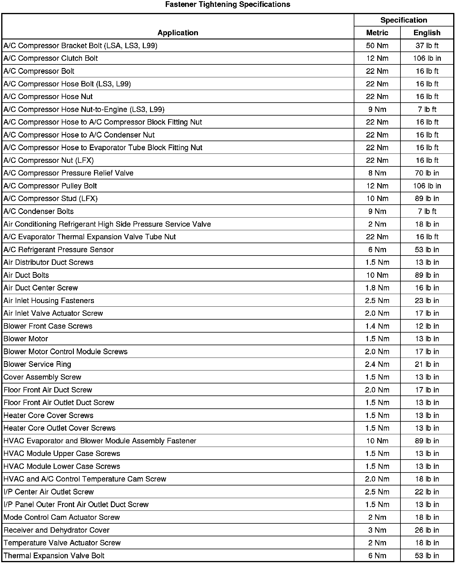 Fastener Tightening Specifications