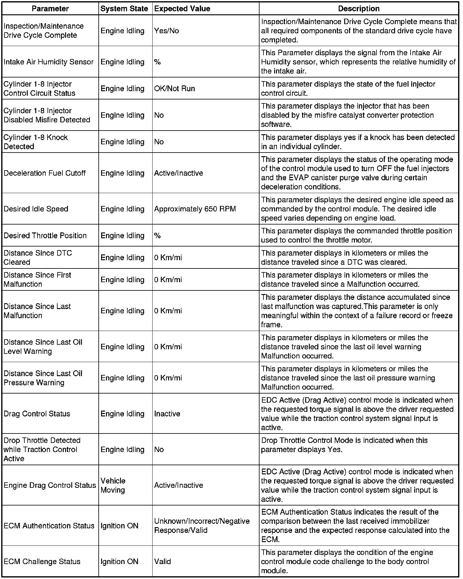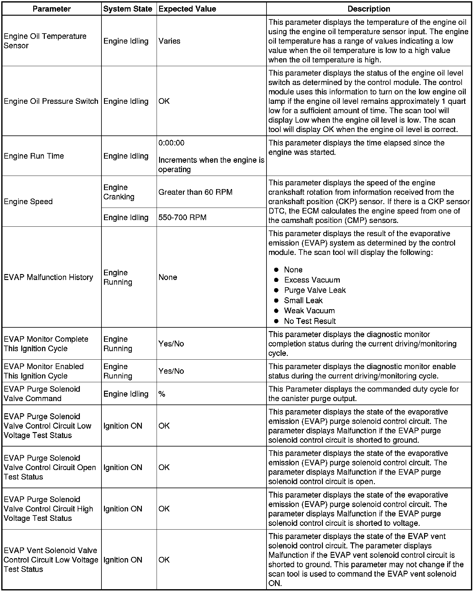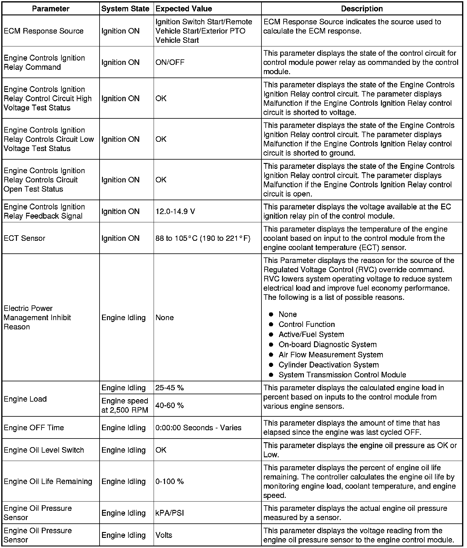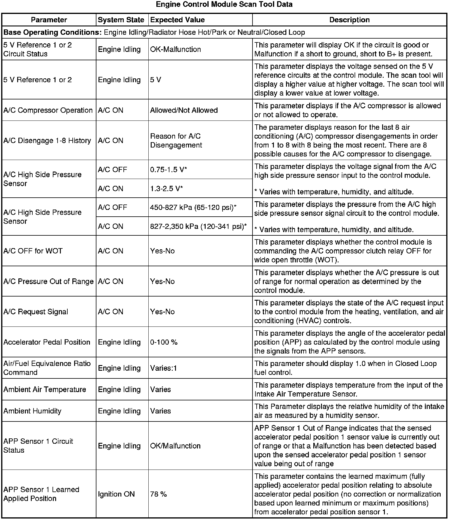 The Engine Control Module Scan Tool Data List contains all engine-related parameters that are available on the scan tool. The list is arranged in alphabetical order. A given parameter may appear in any one of the data lists, and in some cases may appear more than once, or in more than one data list in order to group certain related parameters together.
