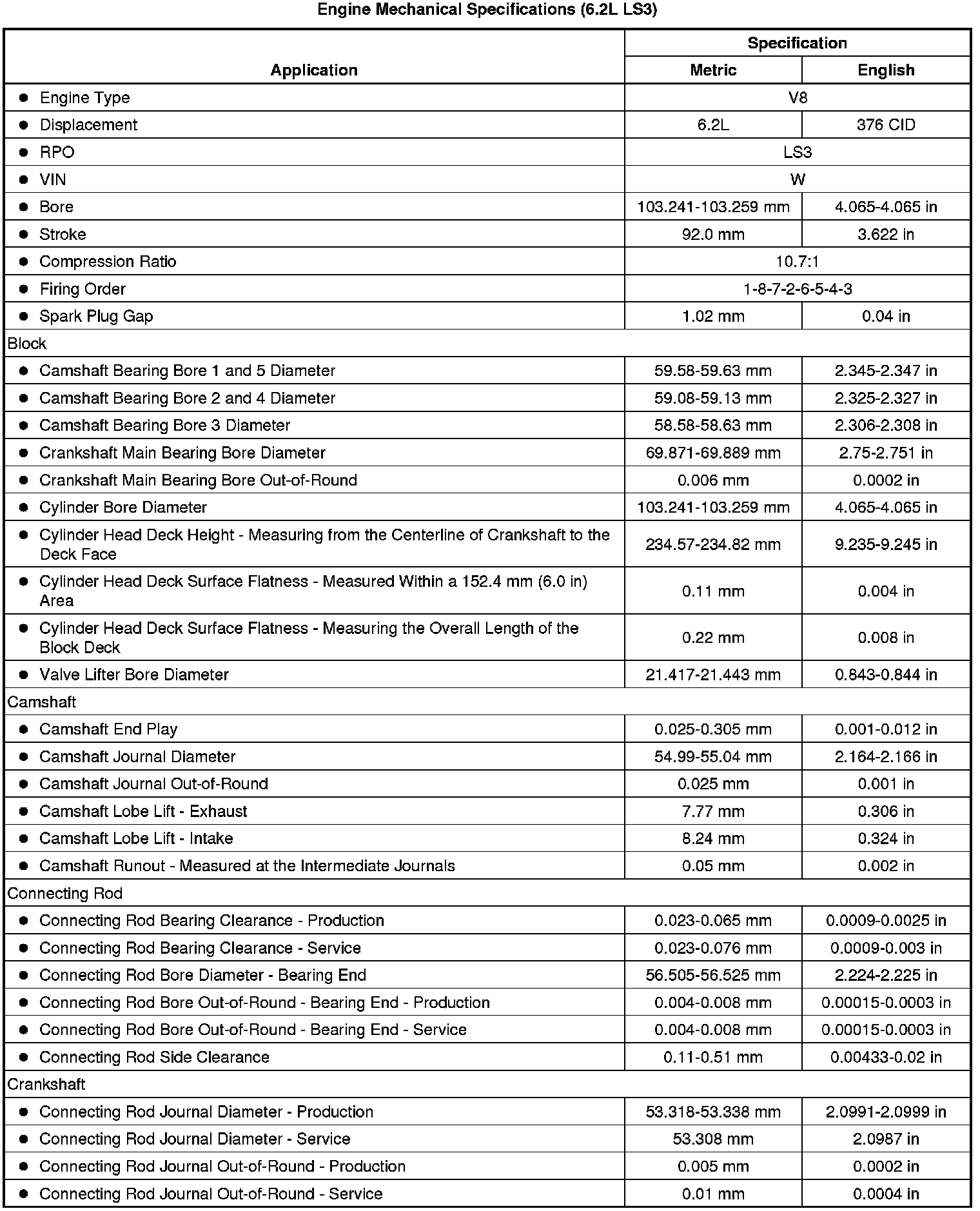 Engine Mechanical Specifications (6.2L LS3)