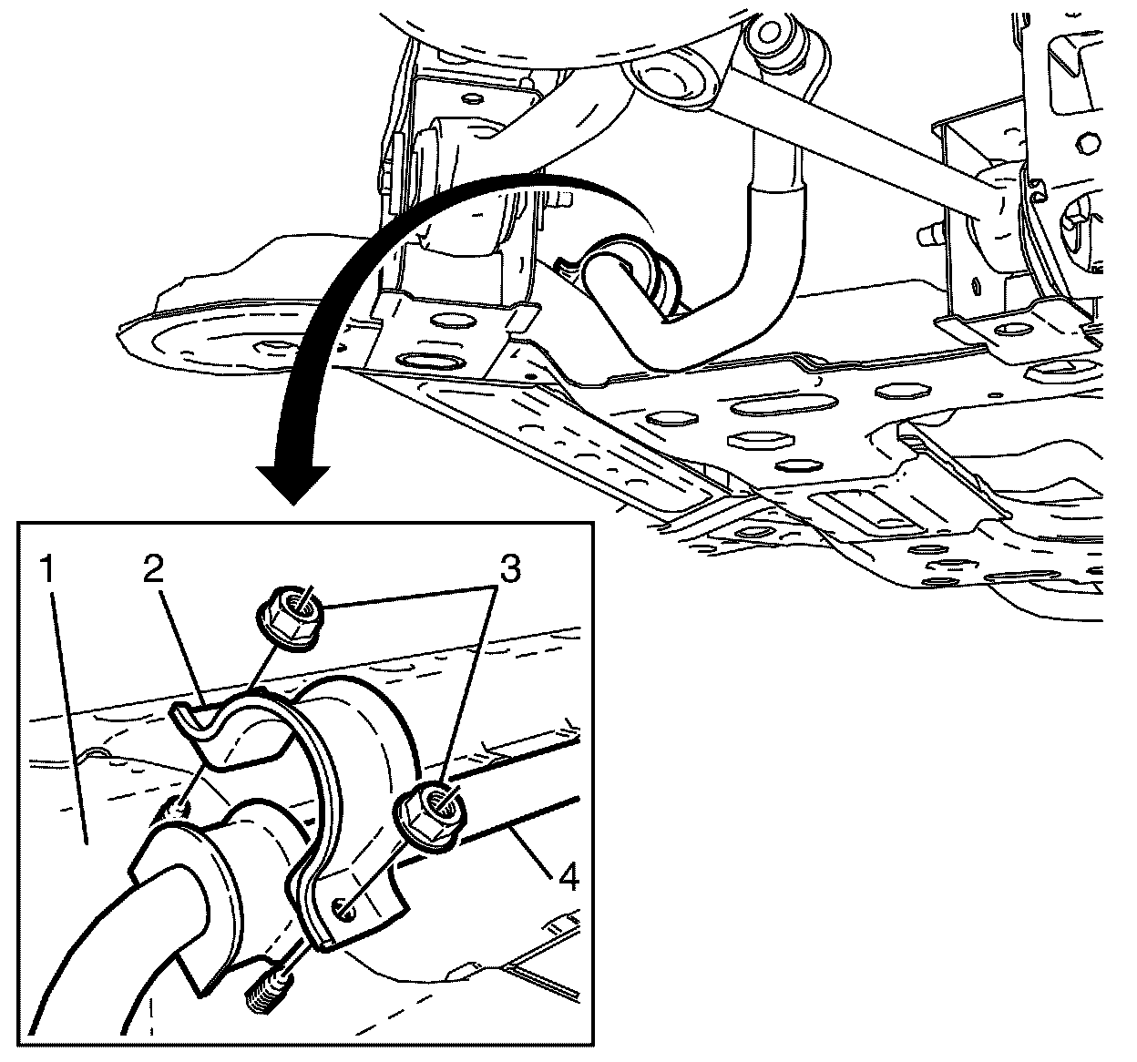 19.Remove the stabilizer bar insulator bracket to subframe retaining nuts (3) on both sides of the stabilizer bar (4). Repeat for the opposite side.
