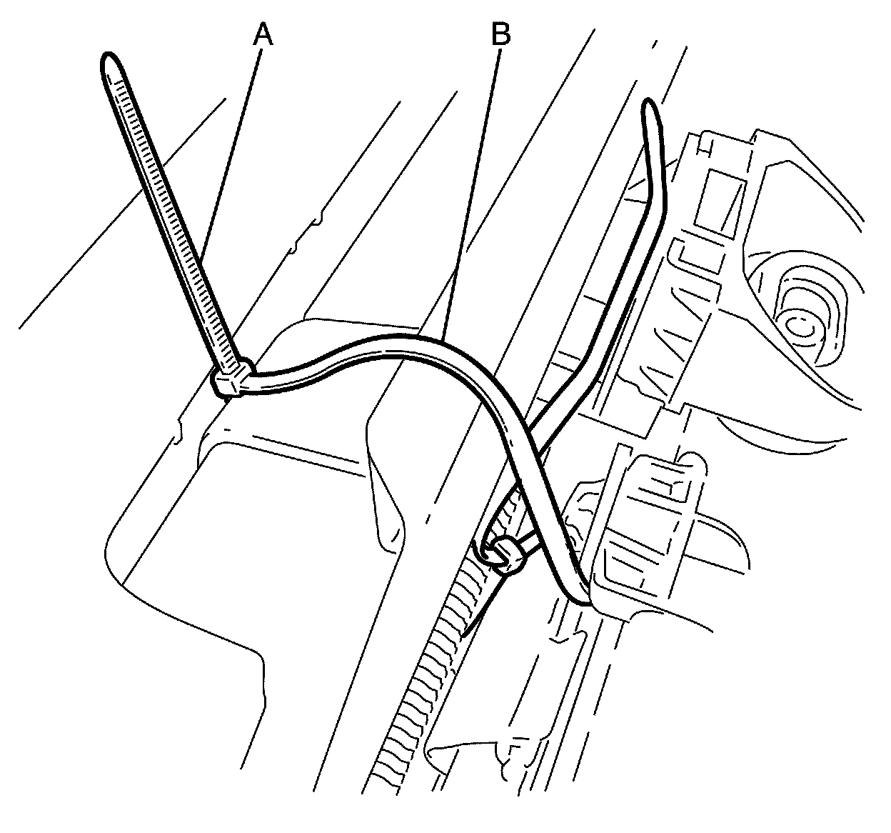 -Thread zip tie (A) around the front end assembly and zip tie (B) through the radiator and condenser mount. Insert zip tie (A) into the retainer of zip tie (B) and insert zip tie (B) into the retainer of zip tie (A).