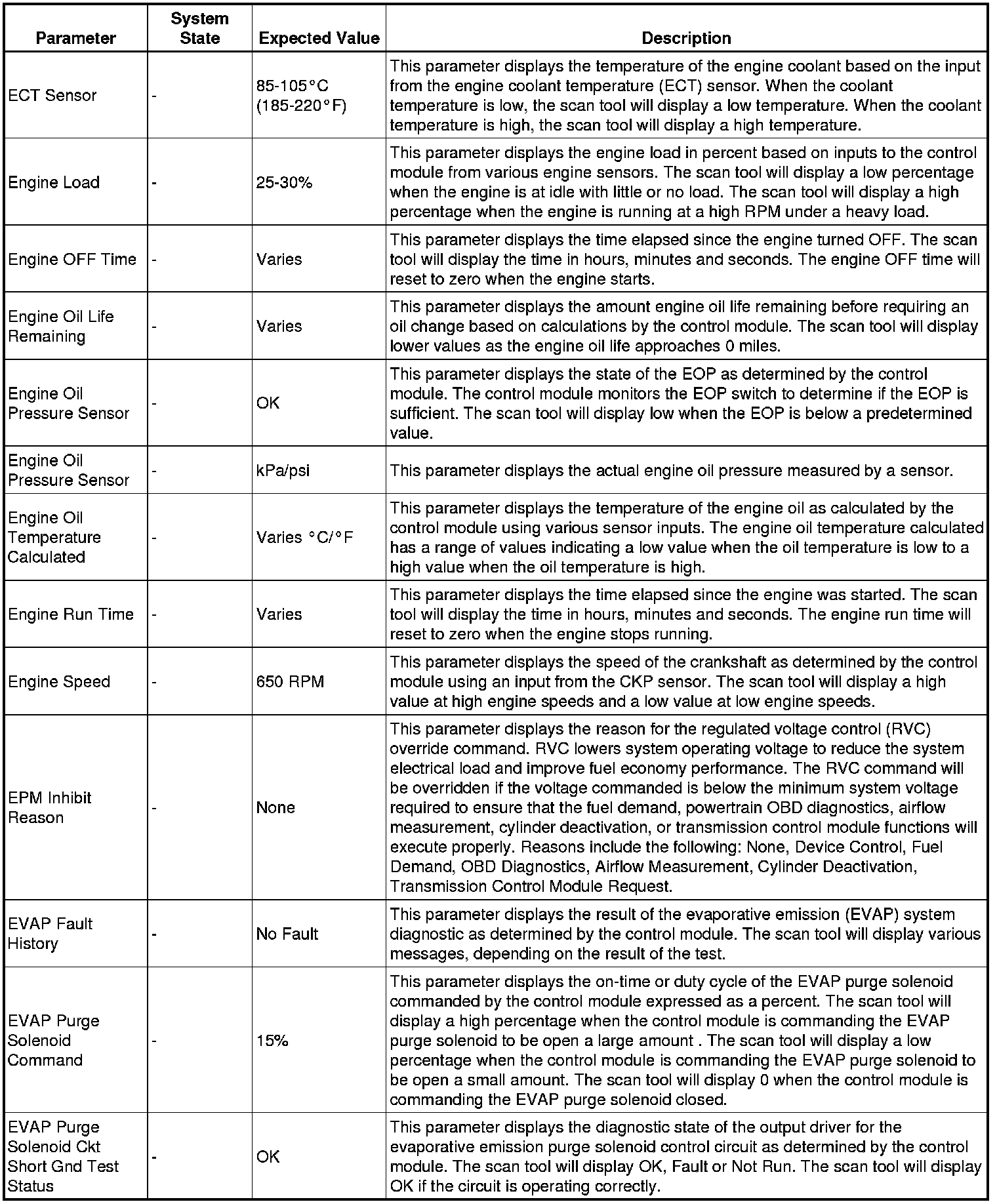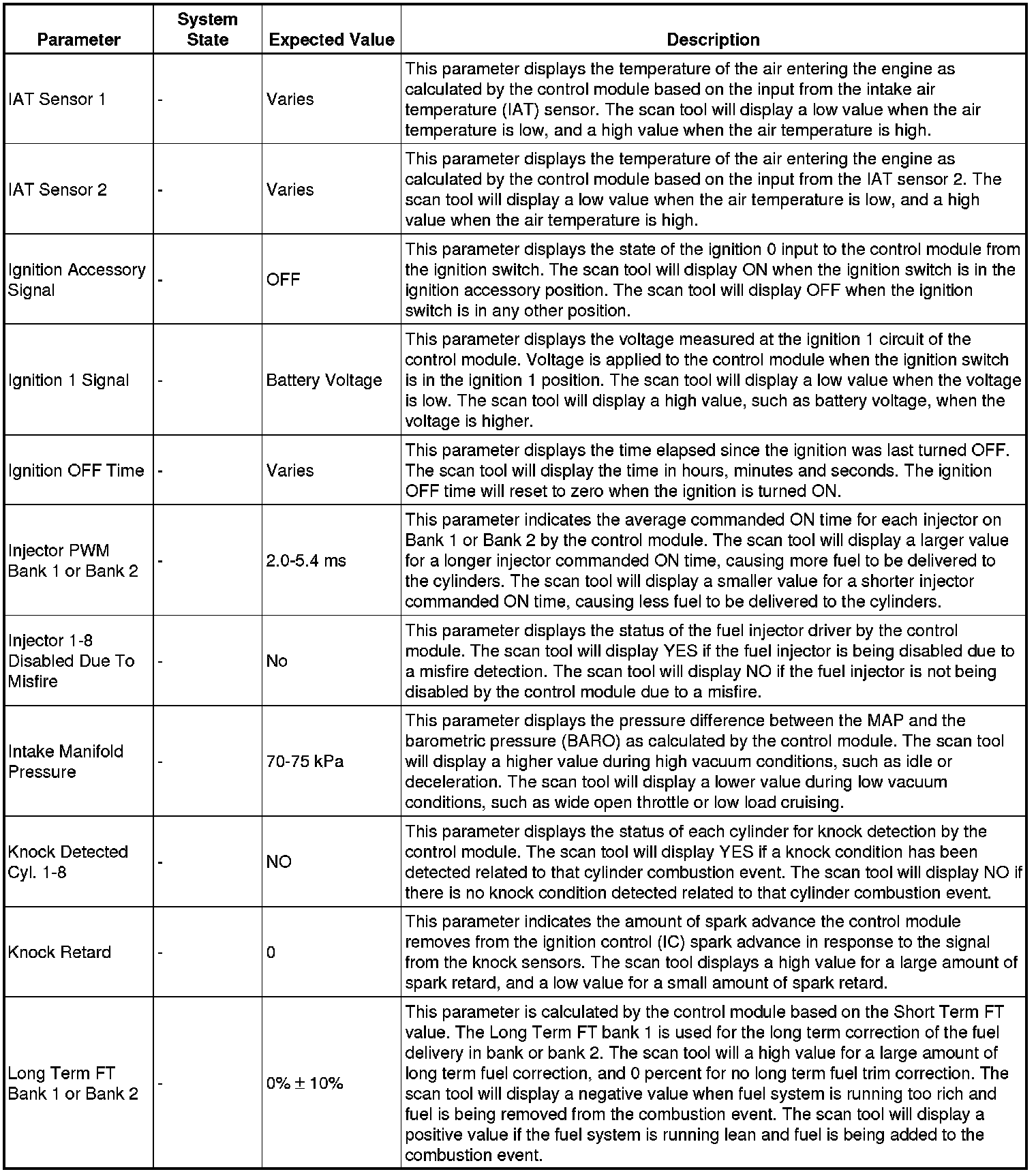 The scan tool values from a properly running engine may be used for comparison with the engine you are diagnosing. The engine scan tool data list represents values that would be seen on a normally running engine.