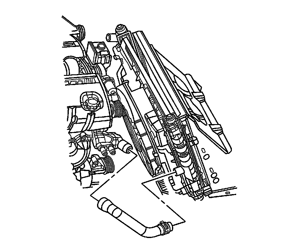 14. Vehicles equipped with a transmission oil cooler, disconnect the lower transmission oil cooler line from the radiator. Refer to Transmission Fluid Cooler Hose/Pipe Quick-Connect Fitting Disconnection and Connection Transmission Fluid Cooler Hose/Pipe Quick-Connect Fitting Disconnection and Connection.