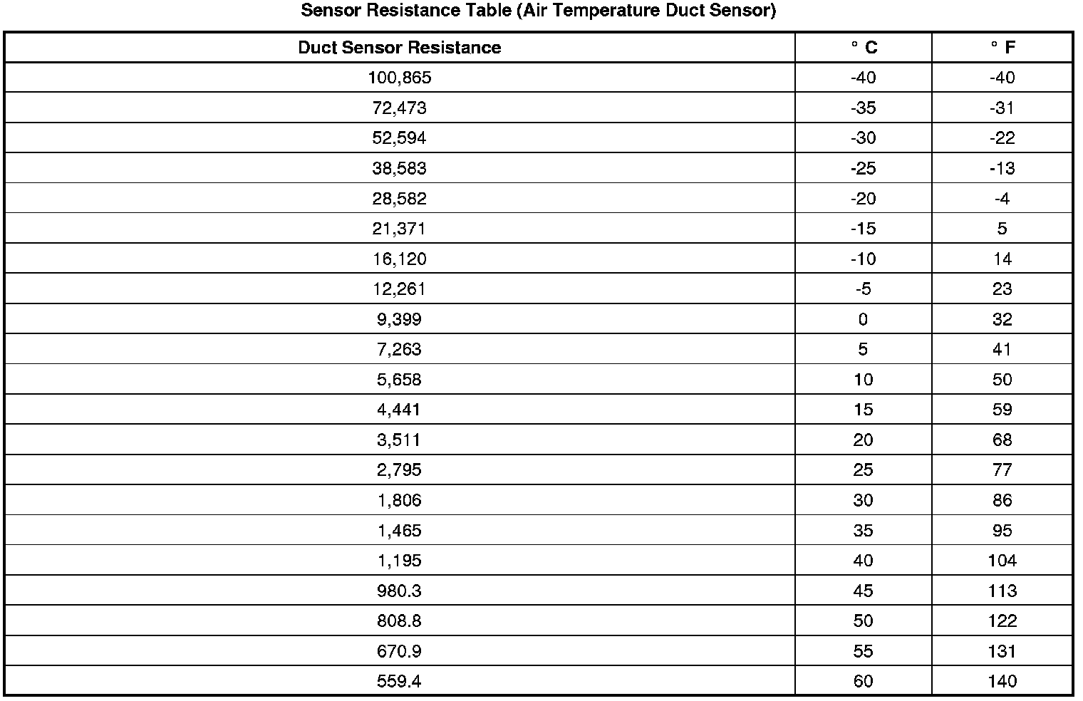 Sensor Resistance Table (Air Temperature Duct Sensor)