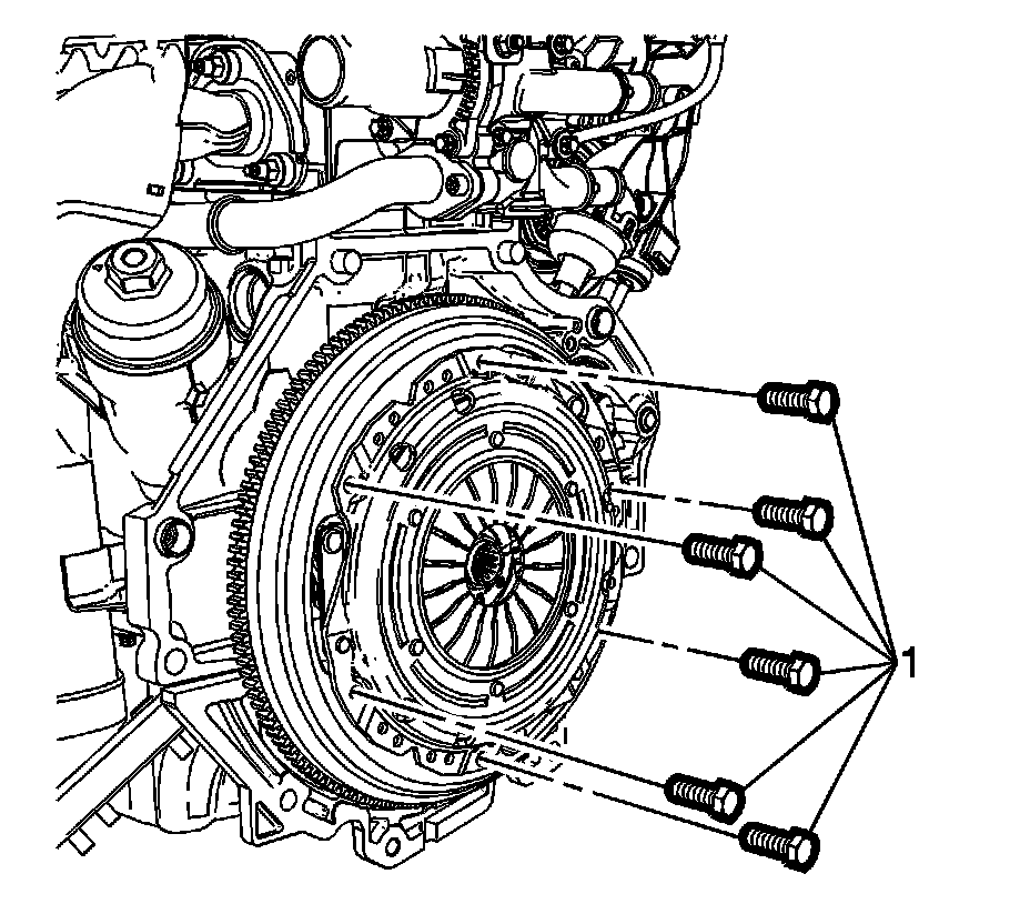 4. Install 6 NEW clutch pressure plate bolts (1) and tighten crosswise to 15 Nm (11 lb ft).