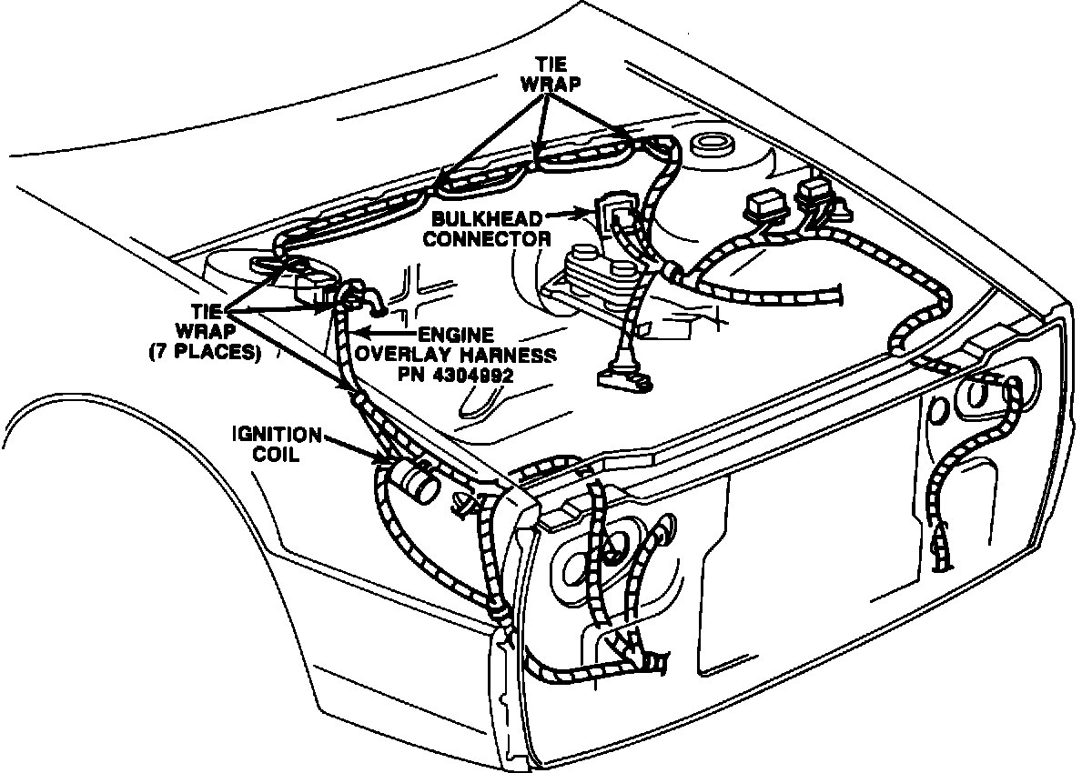 3. Route engine compartment overlay harness, PN 4304992, across the cowl and down right fender shield to coil. Secure to main engine harness (on vehicles with harness routing as shown in Figure 1-A) with seven tie wraps, PN 6015756, evenly spaced (Figure 1-A). On vehicles where main harness routing is different than in Figure 1-A, tie wrap overlay harness to convoluted hose harness.