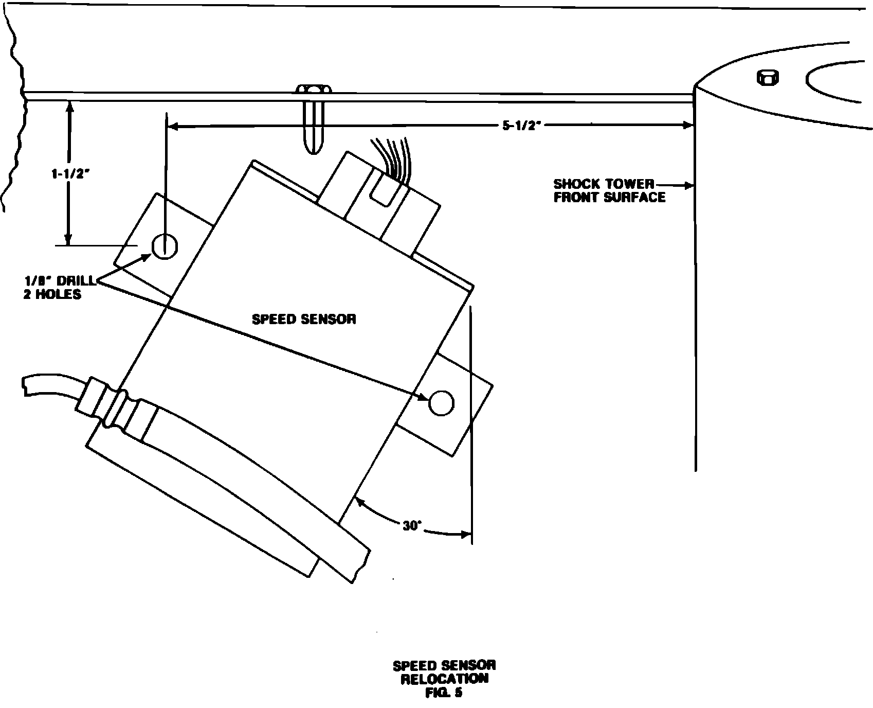 To relocate sensor, mark and drill 1/8" hole for upper sensor mount on right fender shield (Figure 5). Reattach sensor with upper screw. Adjust the speed sensor to a 30~ angle as shown, center punch, and drill 1/8" hole for the second attaching screw. Install the second screw and tighten both screws securely.