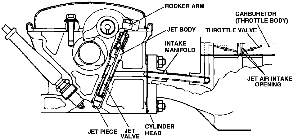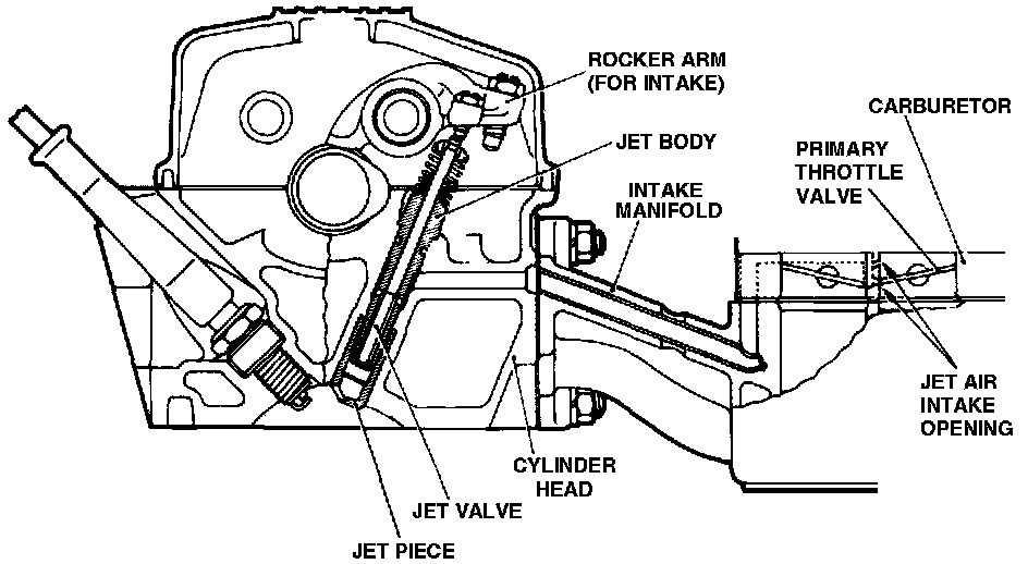 The jet valve assembly consists of a jet valve, jet body and spring. This assembly is threaded into the jet piece which is pressed into the cylinder head. The opening in the jet piece should face the spark plug. Jet air passages are provided in the carburetor, intake manifold and cylinder head.