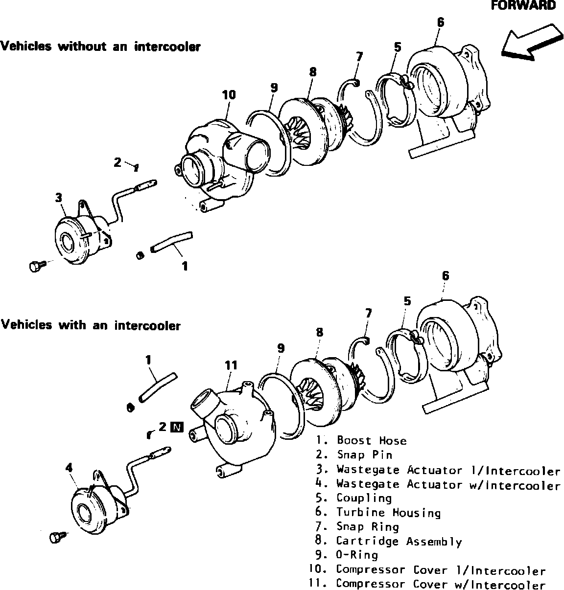 Fig. 4 Exploded view of turbocharger assembly. 1987-88 Models w/2600cc engine: