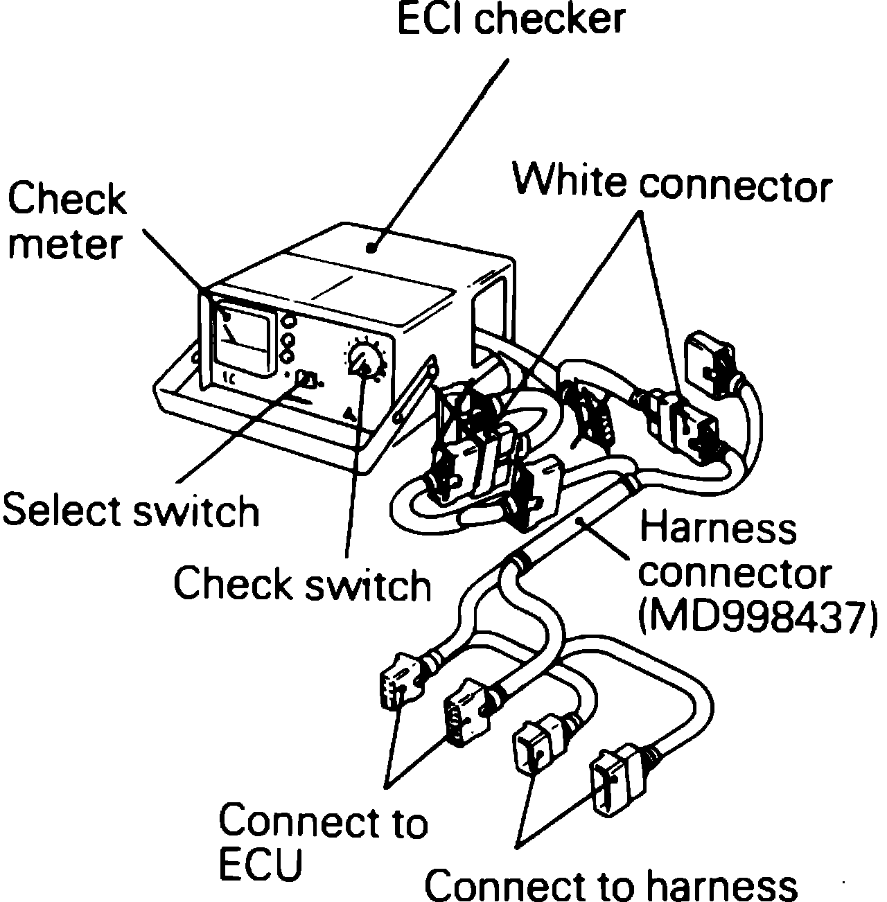 c. Connect white color connectors labeled CHECKER, of harness connector to connectors of ECI checker. Connect harness connector to ECU and harness connector, Fig. 44.