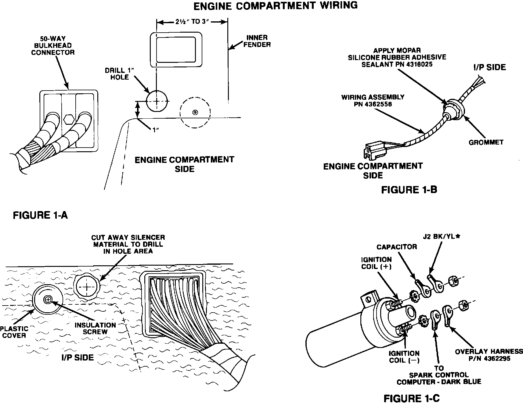 2. Drill a 1-inch diameter hole as dimensioned in Figure 1-A, making sure there are no obstructions. The silencer material on the passenger compartment side will have to be cut away as needed. Apply Mopar Silicone Rubber Adhesive Sealant, PN 4318025, as shown in Figure 1-B to the grommet of wiring assembly, PN 4362558, and install it from the instrument panel side to the engine compartment and seat grommet into newly drilled hole.