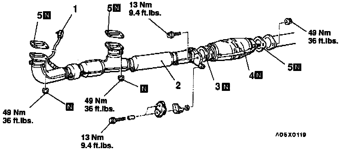 Inspect for damage, cracking or deterioration. Replace the catalytic converter if obvious damage is found.
