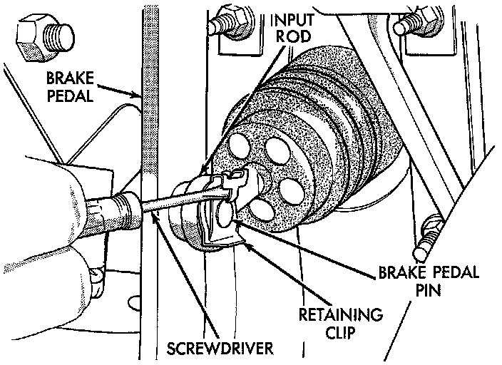 17. Locate the power brake vacuum booster input rod to brake pedal attachment under instrument panel. Position a small screwdriver between the center tang on the power brake booster input rod to brake pedal pin retaining clip. Rotate screwdriver enough to allow retaining clip center tang to pass over end of brake pedal pin. Then pull retaining clip off brake pedal pin. Discard retaining clip. Replace only with a new retaining clip when assembled.