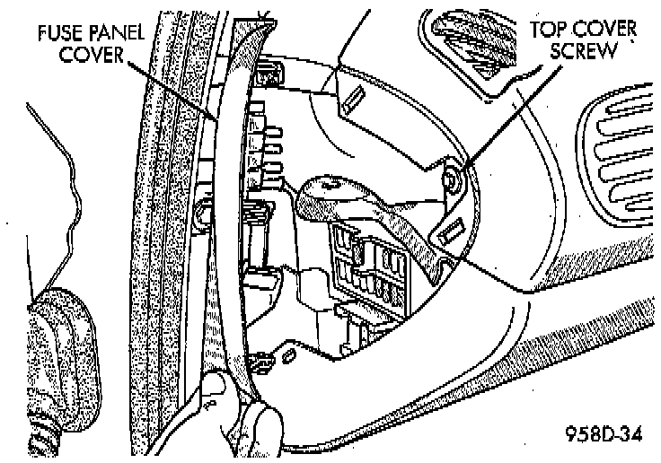 22. Install screw behind fuse panel cover holding instrument panel top cover. Install fuse panel cover on left end of instrument panel.