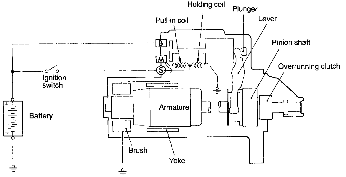 When the plunger is attracted, the lever connected to the plunger engages the starter clutch and completes the circuit between the "B" and "M" terminals, providing current to the starter motor.