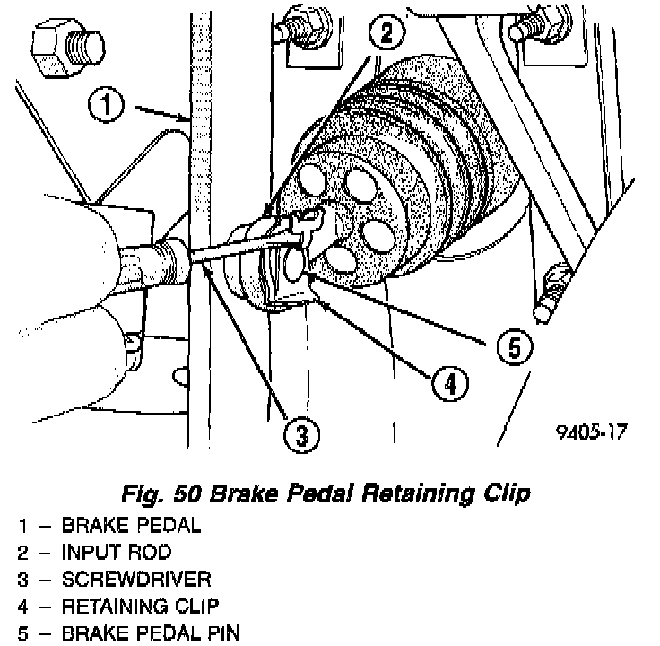 6. Remove the retaining clip from the brake pedal pin securing the power booster to the pedal using following procedure. Position a small screwdriver between the center tang on the retaining clip and the brake pedal pin. Rotate blade of screwdriver enough so center tang on retaining clip can pass over end of brake pedal pin, then pull retaining clip off brake pedal pin.