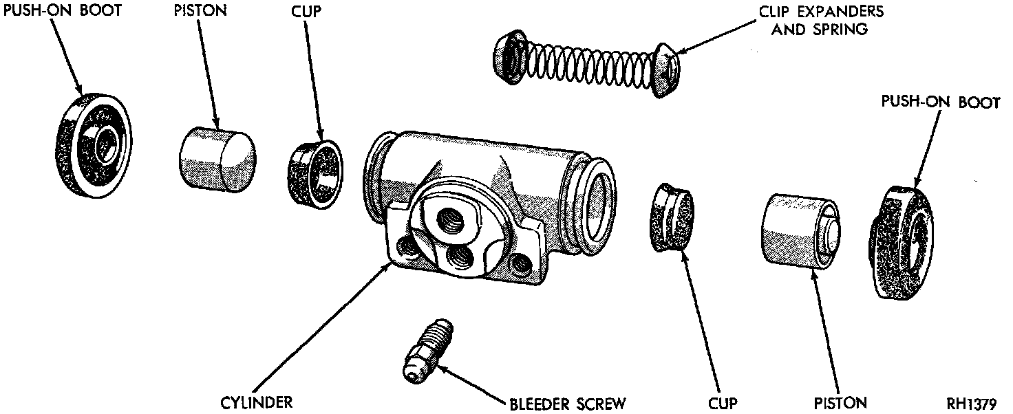 4. Wheel cylinder bores and pistons that are badly scored or pitted should be replaced. Cylinder walls that have light scratches, or show signs of corrosion, can usually be cleaned with crocus cloth, using a circular motion. Black stains on the cylinder walls are caused by piston cups and will not impair operation of cylinder.