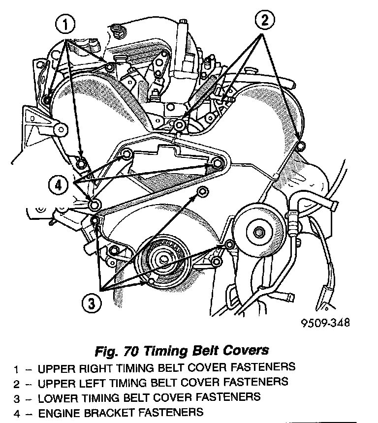 7. Remove the timing belt covers (Fig. 70). Remove covers in this order: