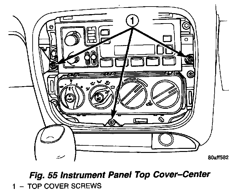 8. Remove screws holding instrument panel top cover to center of instrument panel (Fig. 55).