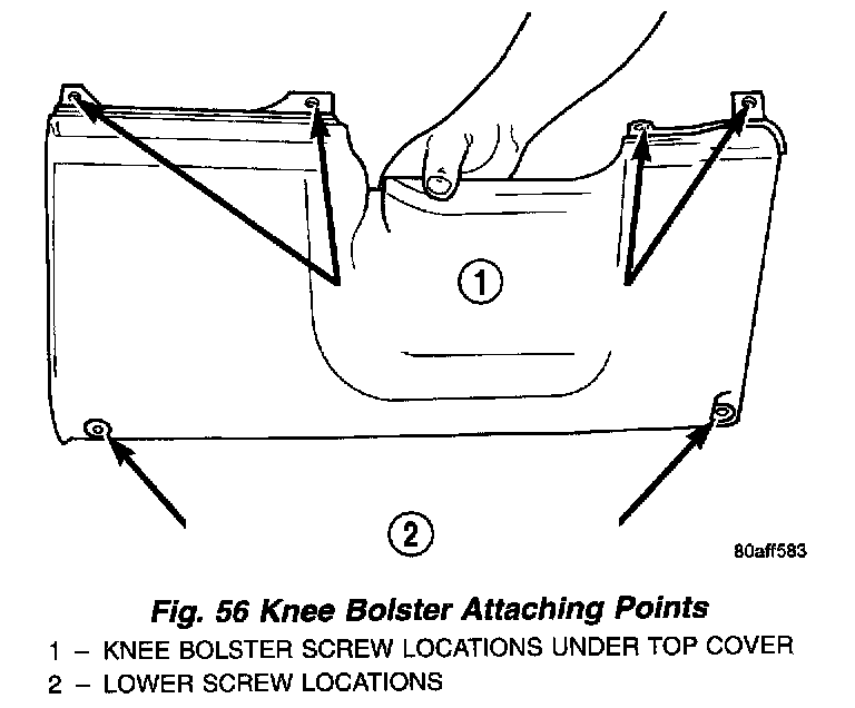 9. Pull instrument panel top cover up enough to gain access to knee bolster screws (Fig. 56).