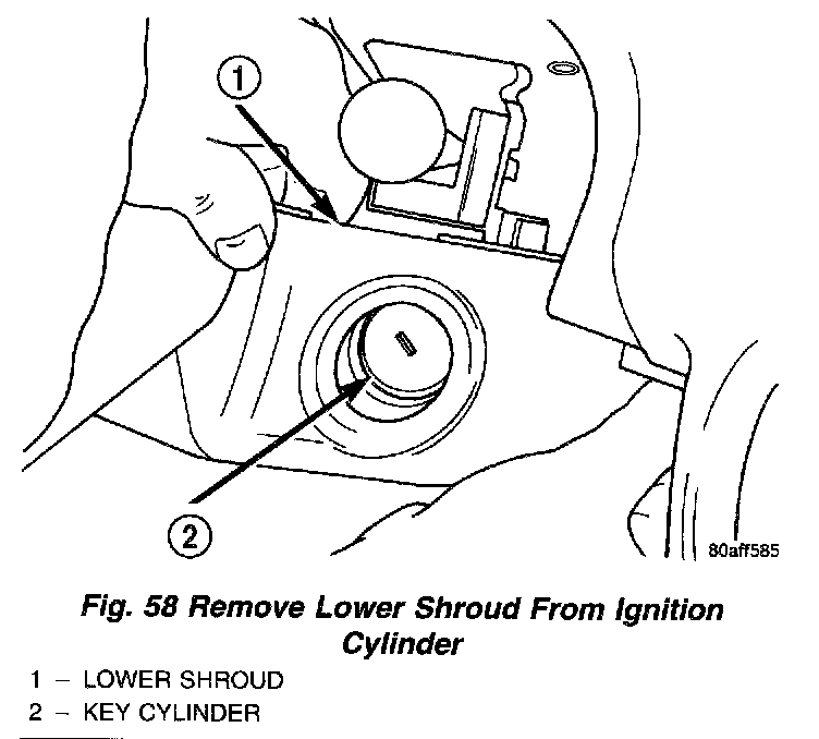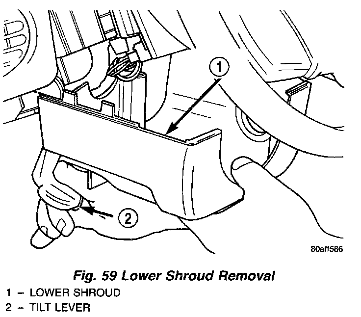 13. Hold tilt wheel lever down and slide lower shroud forward to remove it from column (Fig. 59).