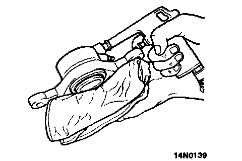 Protect caliper body with shop towel. Blow compressed air through brake hose to remove piston boot and piston.