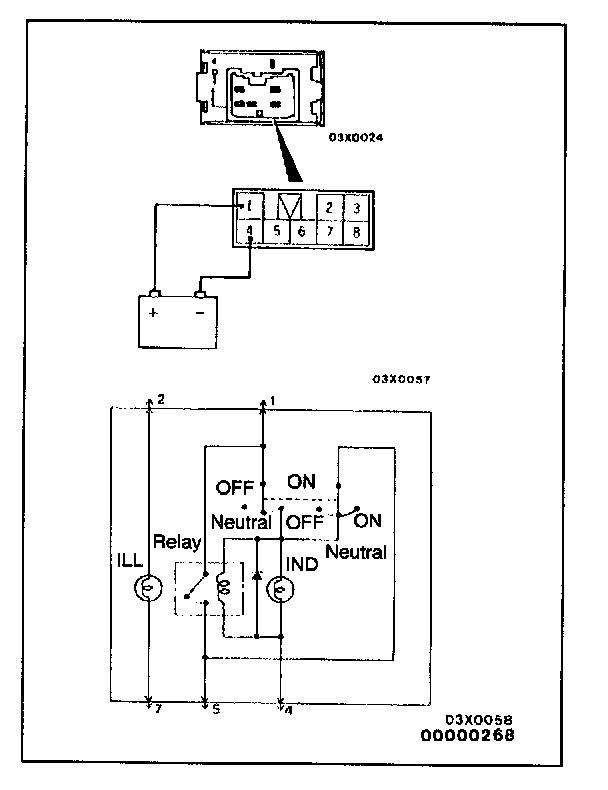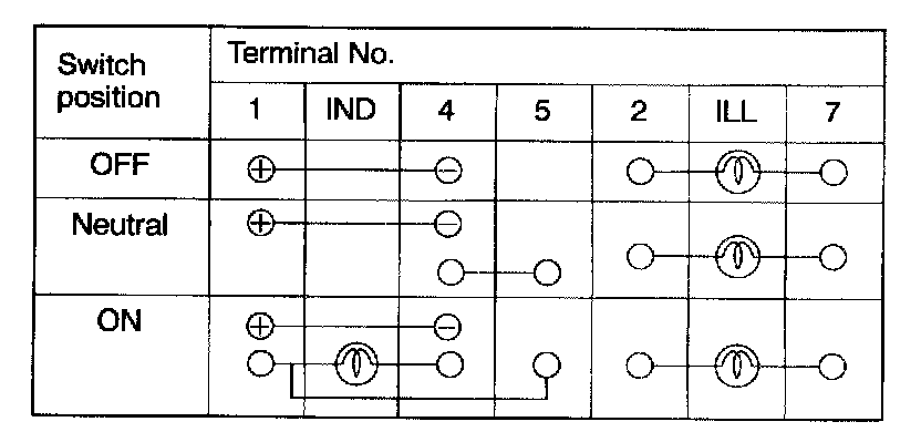 2. When the battery (+) side is connected to terminal 1 and the (-) side is connected to terminal 4, and the main switch is turned to ON, check if battery voltage is output between terminal 5 and the ground until the main switch is turned to OFF.