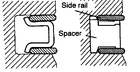 (2) A side rail can be easily installed by fitting one end of the side rail in the piston groove and pressing the remaining portion into position by finger as shown.