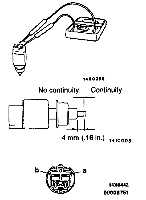 Connect an ohmmeter to the stop light switch, and check whether or not there is continuity when the plunger of the stop light switch is pushed in and when it is released. The stop light switch is in good condition if there is no continuity when the plunger is pushed in to a depth of within 4 mm (0.16 inch) from the outer case edge surface, and if there is continuity when it is released. A continuity should be checked between connectors "a" and "b" of the stop light switch.