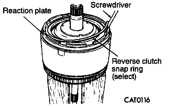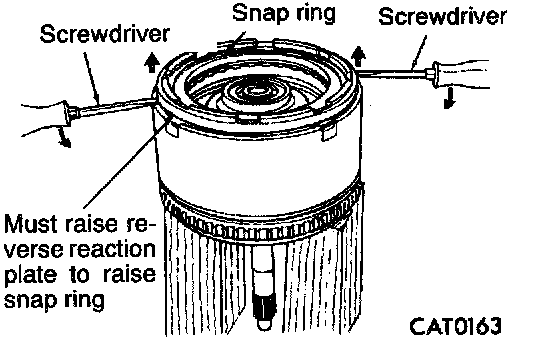 27. Raise reverse clutch reaction plate by prying up at two locations with screwdrivers to seat snap ring.