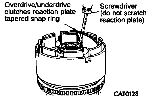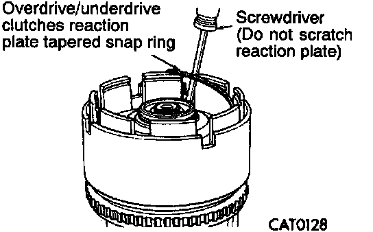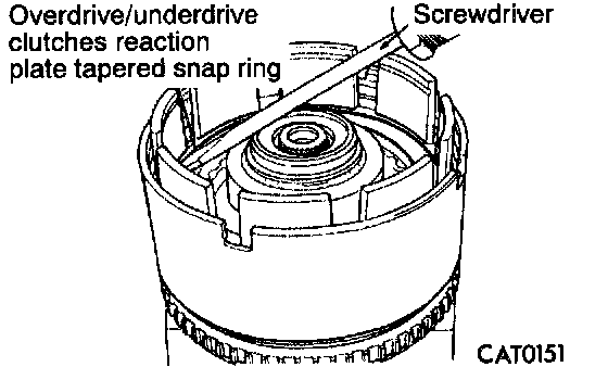 14. Remove overdrive/underdrive clutches reaction plate tapered snap ring.
